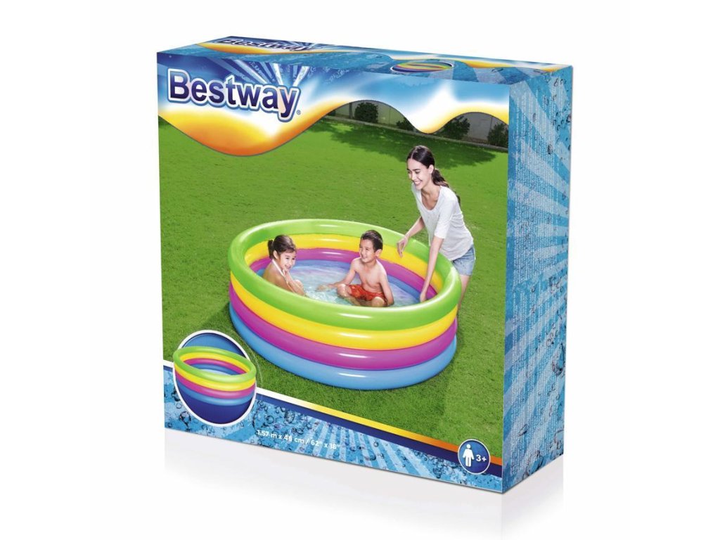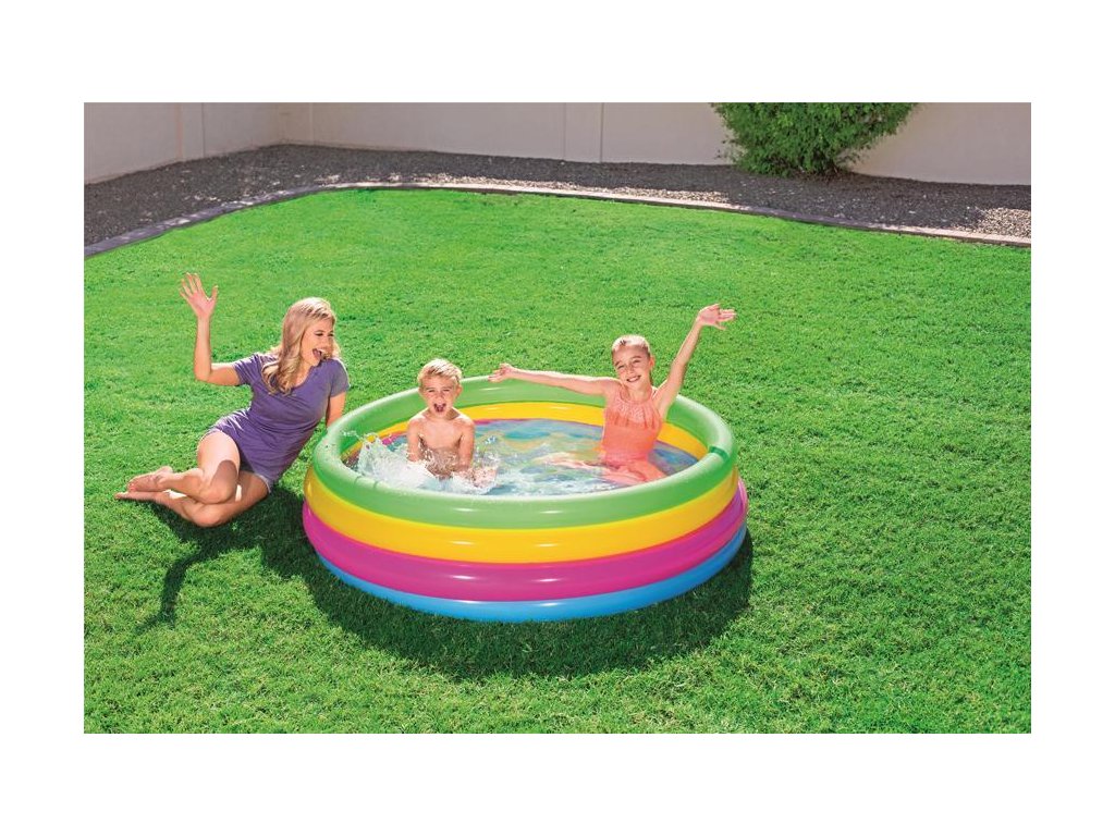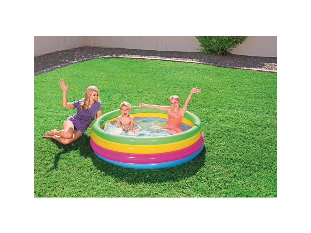 Farebná 4-prstencová nafukovacia konštrukcia je nie len pútavá pre deti, ale zároveň ponúka stabilitu, odolnosť a trvácnosť. Výhodou je jej jednoduché zostavenie aj odloženie. Stačí nafúknuť 4 prstence vzduchom a Váš bazén je pripravený na napustenie vodou. Špliechanie na slnku nikdy nebolo zábavnejšie ako s dúhovým nafukovacím bazénom Bestway!