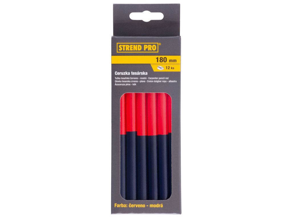 Obojstranná tesárska ceruzka Strend Pro na značenie drevených povrchov s modrou a červenou tuhou. Dĺžka 180 mm. Balenie obsahuje 12 ks.