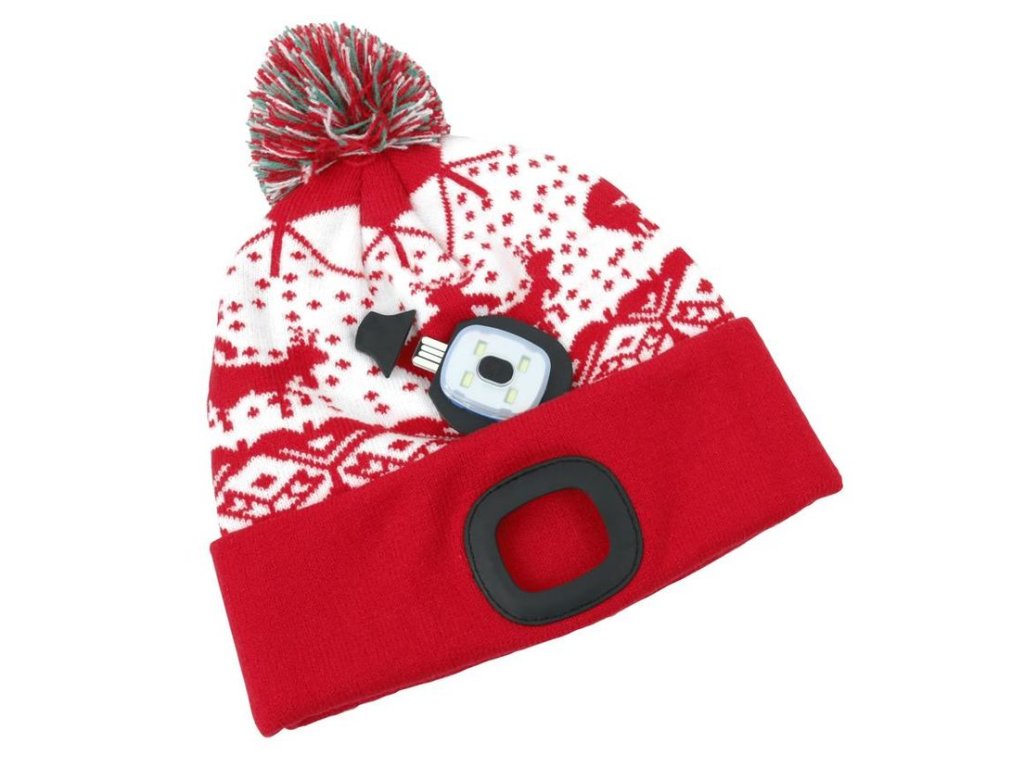 Čiapka Strend Pro X-mas červená L, 4x SMD LED, 60 lm s brmbolcom a vianočným motívom.Led svetlo nabíjateľné USB portom. V zime v teple a svetle.
