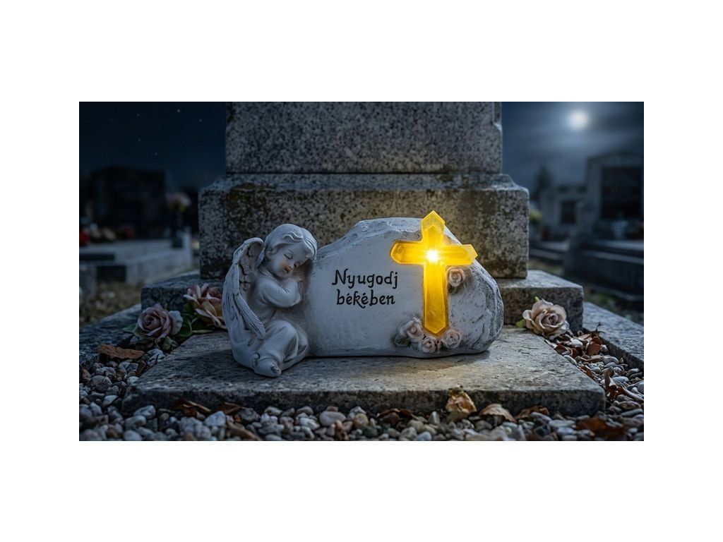 Dekorácia MagicHome, Anjel s krížom, polyresin, na hrob, solar, 20,5x11x11 cm, s maďarským názvom