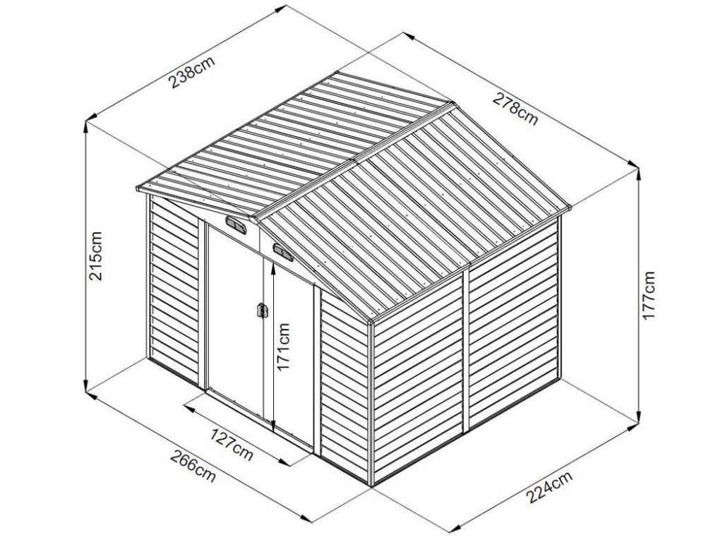Záhradný domček Strend Pro poskytuje dostatočne veľký priestor na uskladnenie záhradného náradia, vybavenia, nábytku či bicyklov. Je vyrobený z vysokokvalitného kovu, ktorý je odolný voči korózii. Otváranie pomocou dvojitých posuvných dverí. Disponuje 4 ventilačnými otvormi pre lepšie prúdenie vzduchu. Skvele sa hodí na akýkoľvek dvor, kde plní nielen praktickú, ale aj estetickú funkciou. Možnosť dokúpenia podlahovej konštrukcie. Farba: hnedá. Rozmery s presahom strech (Š x D x V): 278 x 238 x 215 cm. Rozmery pôdorysu (Š x D): 266 x 224 cm. Všetky rozmery sú na obrázku. Veľkosť dverí: 127 x 171 cm. Hrúbka lakovaného plechu: 0,25 mm, hrúbka pozinkovaného rámu: 0,6 mm.