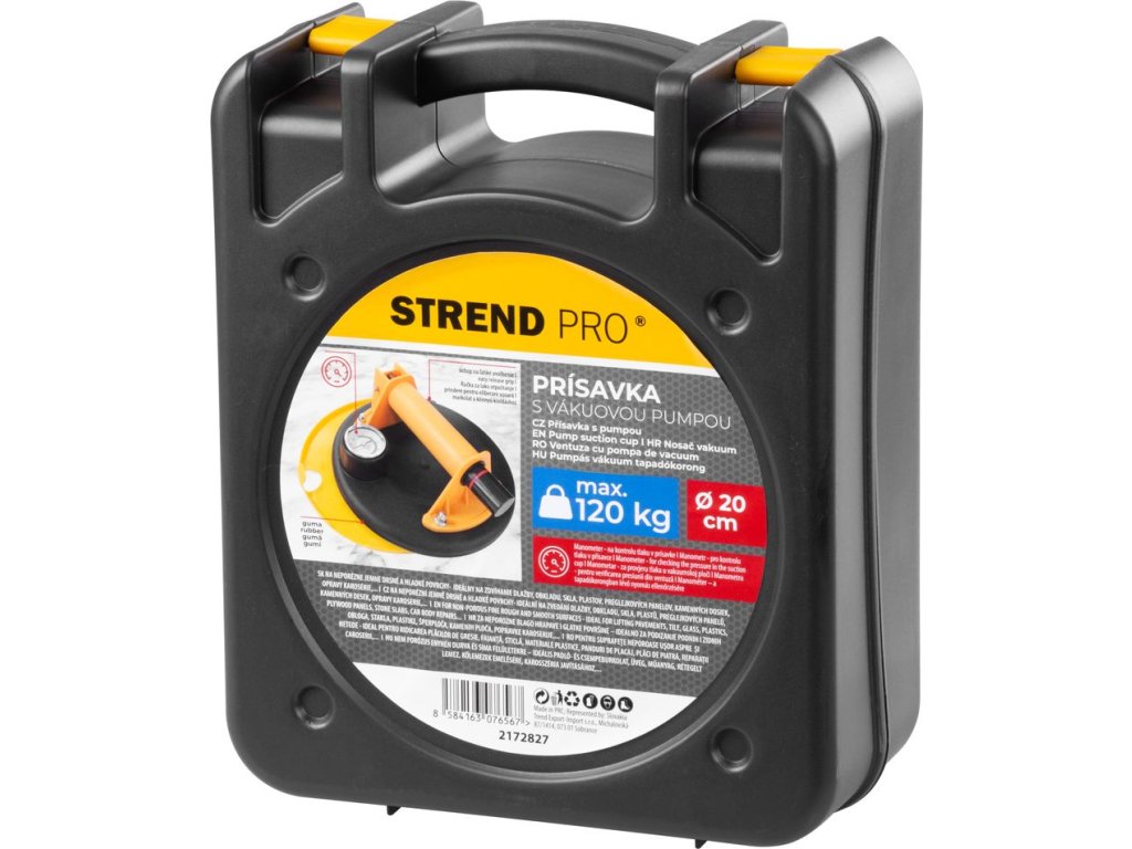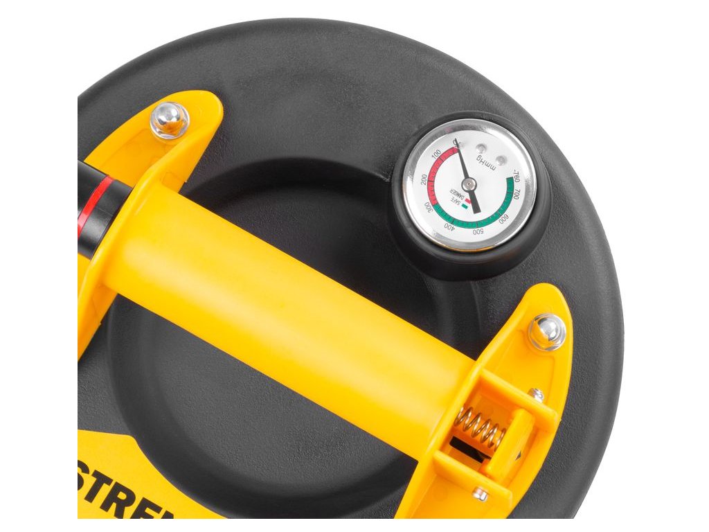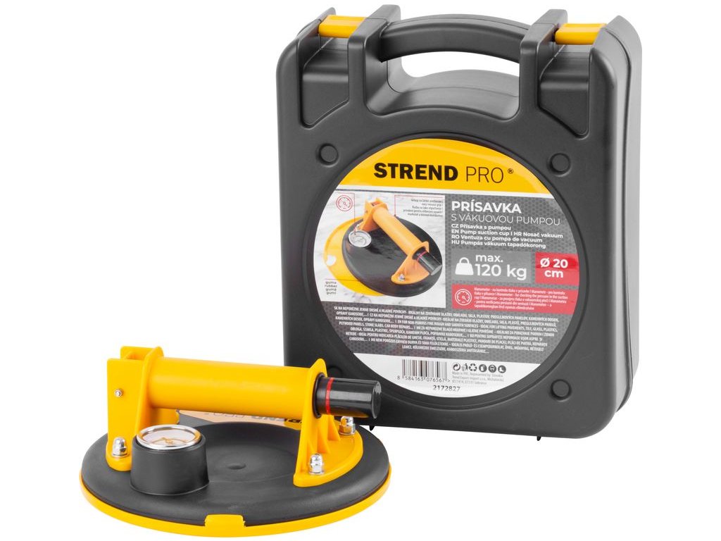 Držiak skla Strend Pro je ideálny na zdvíhanie dlažby, obkladu, skla, plastov, preglejkových panelov, kamenných dosiek a opravy karosérie. Maximálna nosnosť je 120 kg. Obsahuje manometer na kontrolu tlaku v prísavke.