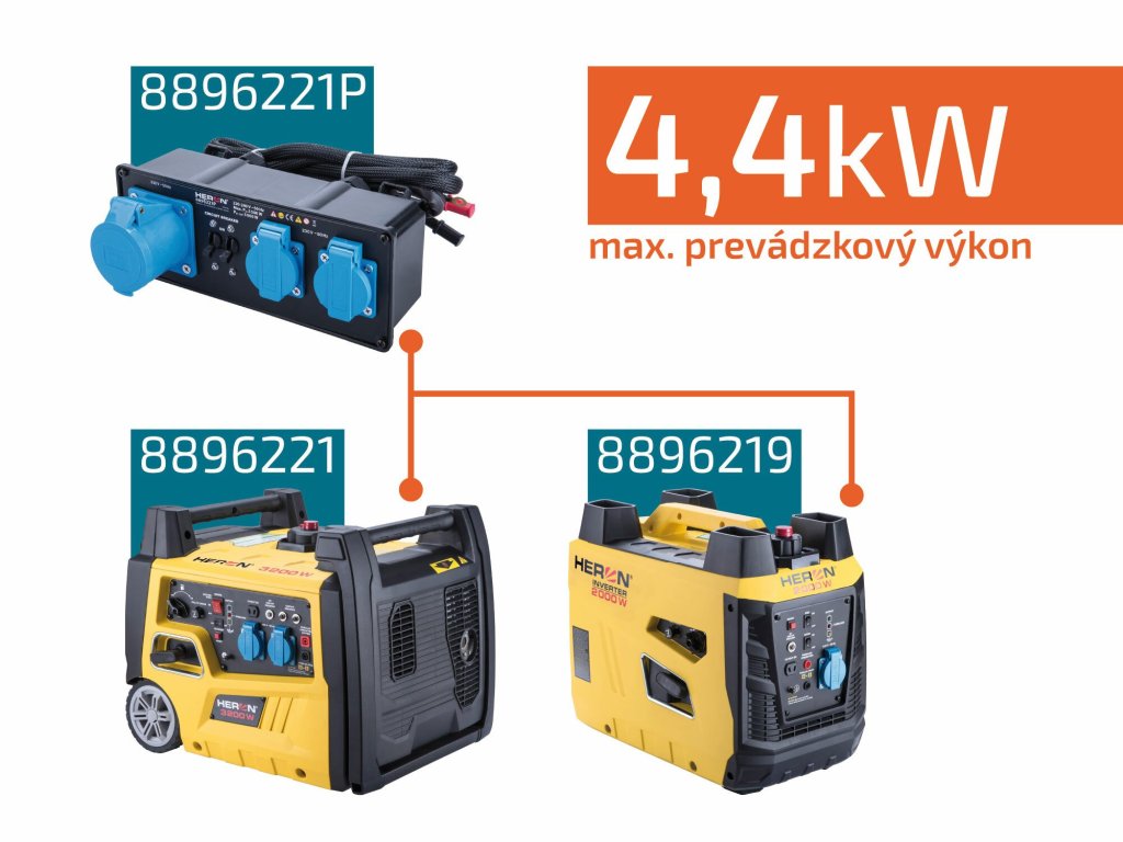 - spojením s druhou elektrocentrálou 8896220, 8896221 alebo 8896222 dosiahnete prevádzkový výkon 5,2kW, pri spojení s elektrocentrálou 8896219 dosiahnete prevádzkový výkon 4,4kW
