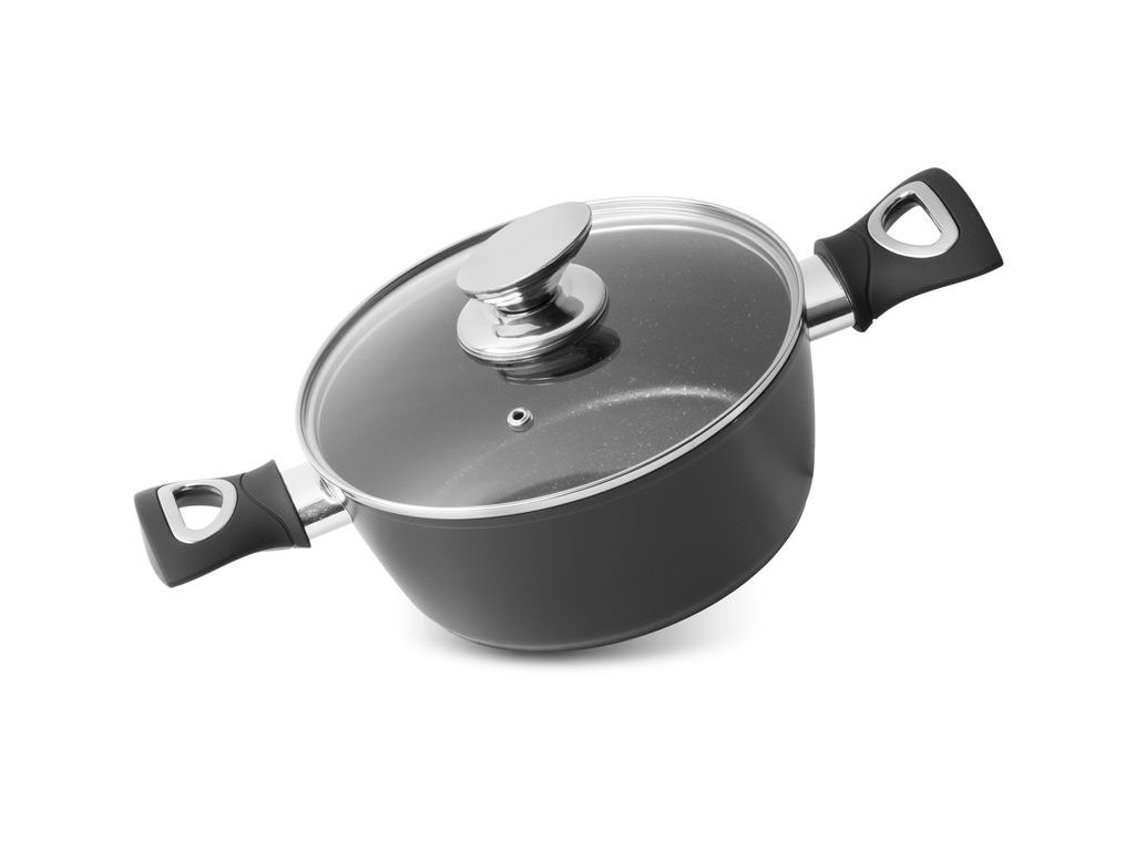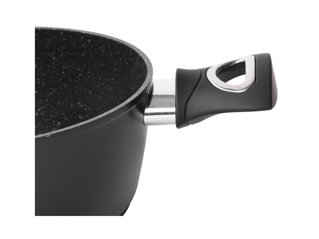 Vnútorný povrch:mramorový náter, nepriľnavý povrch.Vonkajší povrch:matný čierny teplovzdorný náter, jeekologický:- neobsahuje PFOA, PFOS, VOC, olovo ani kadmium.Spodná časť máindukčné dno (3 mm) a šetrí energiu.Rukoväť hrnca jeplastová so silikónovým náterom a INOX s ochranou proti plameňu. Hrniec jevhodný pre všetky typy sporákov:indukcia, elektrika, plyn, sklokeramika.Nevhodný do umývačky riadu.