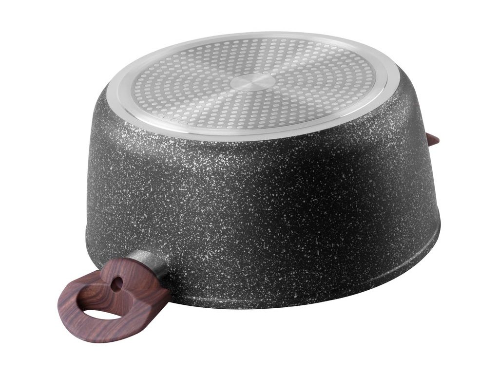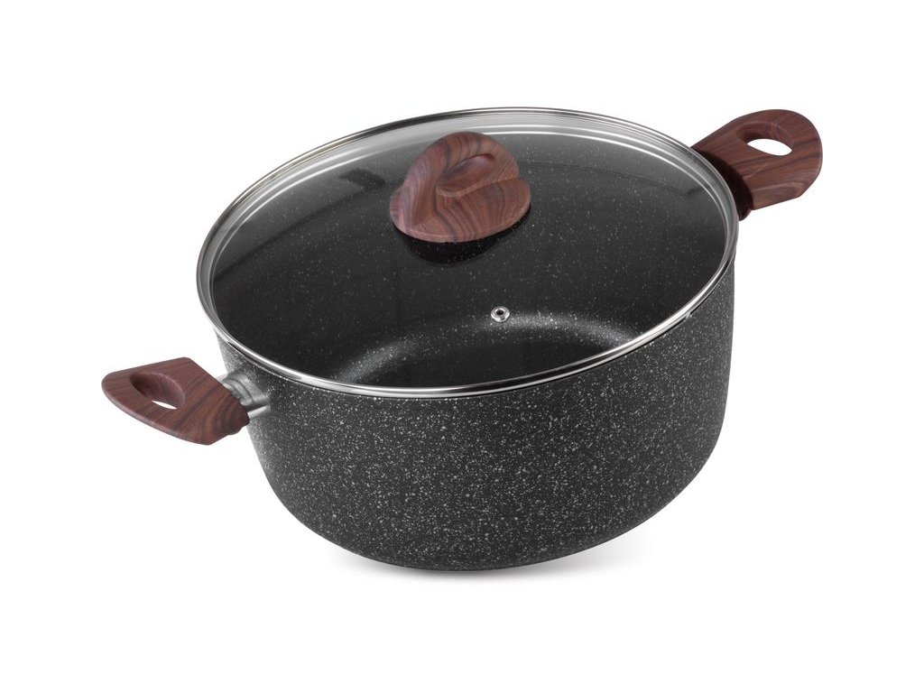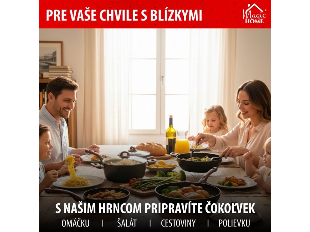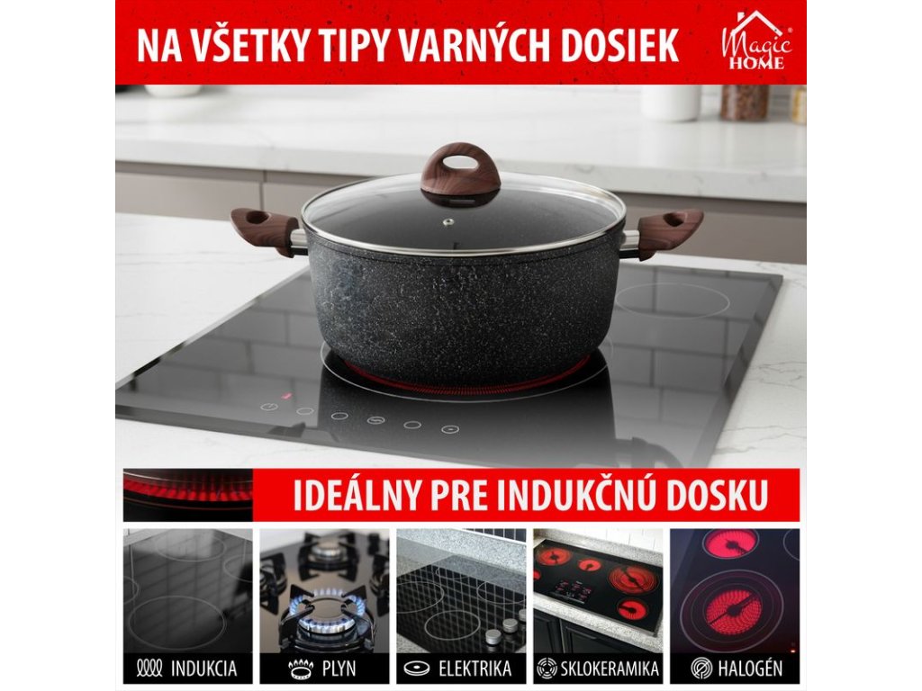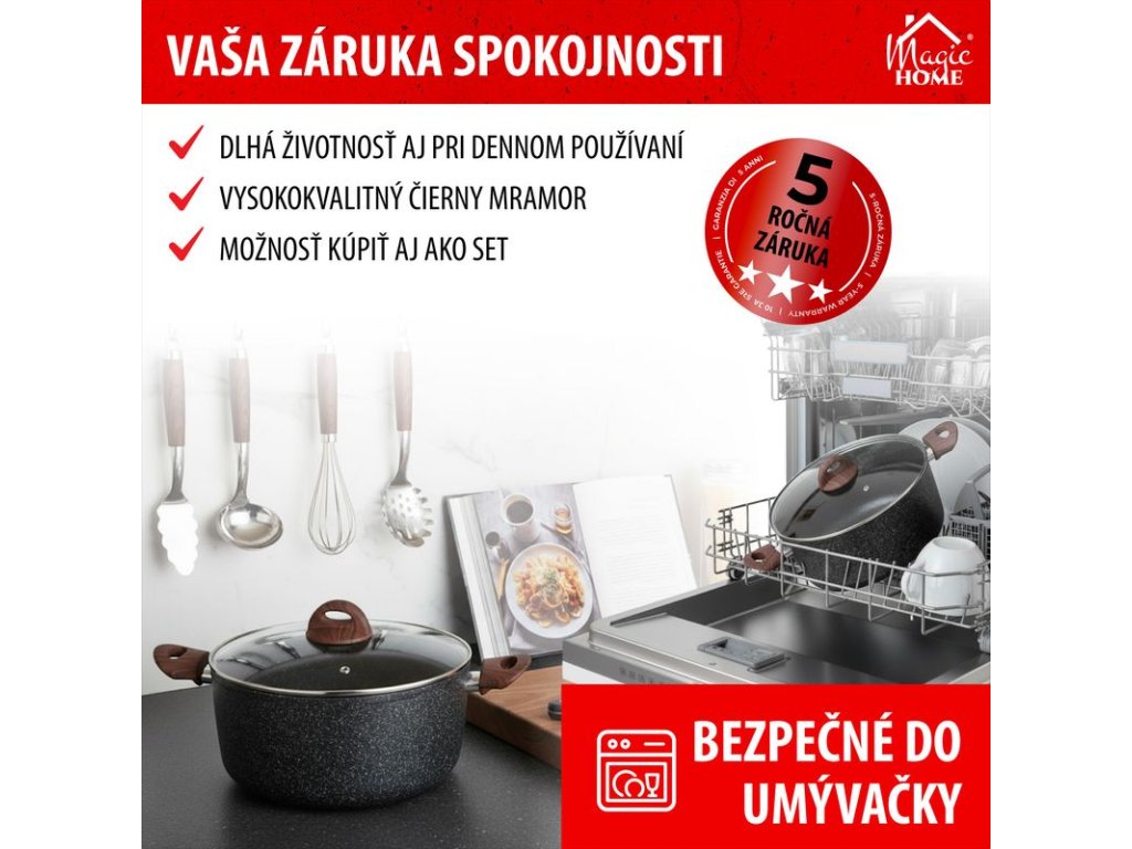 Ak si potrpíte nakvalitnékuchynské riady, tento hrniec je pre Vás ako stvorený. Hrniec s pokrievkou MagicHome Black Marble Line jevyrobený zo zliatiny hliníka s nepriľnavým povrchoma3-vrstvovým mramorovým náterom. Má3 mm indukčné dno, ktoréšetrí energiu. Rukoväť obsahuje drevený náter s ochranou proti plameňu. Hrniec jevhodný na všetky typy sporákov: indukcia, elektrika, plyn, sklokeramika a halogén a je tiež vhodný do umývačky riadu. Nevhodný do rúry. Ješetrný k životnému prostrediu, neobsahuje PFOA, PFOS, VOC, PB ani CD. Objem: 5,9 litrov.