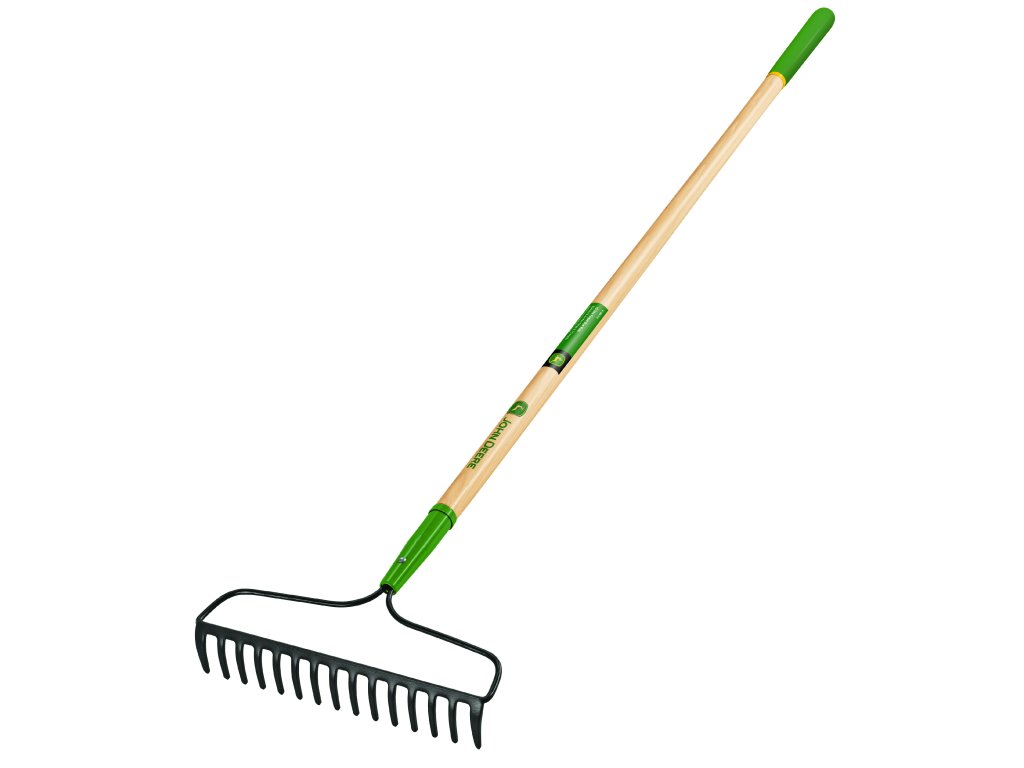 John Deere – Kované hrable R-15AM-X-JD: odolné hrable s kovanou oceľovou hlavou a 15 hrotmi, vybavené drevenou rukoväťou pre pohodlnú manipuláciu pri záhradných prácach.