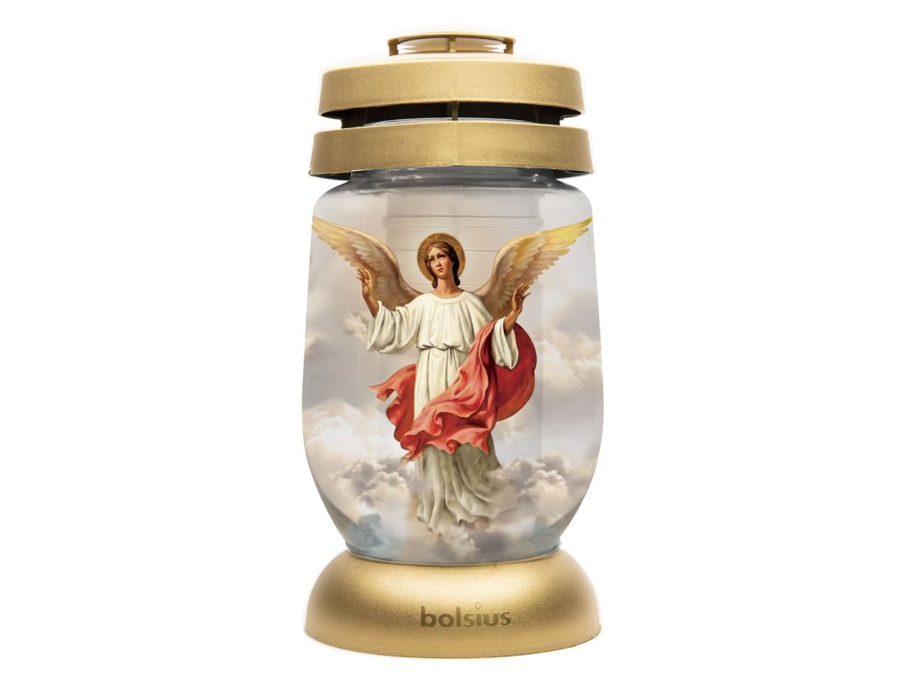 Kahanec Anjel v odtieňoch zlatej so zlatými akcentmi. Vyrobené z kvalitného priehľadného skla, cez ktoré je krásne vidieť plameň. Vďaka veľkej základni je veľmi stabilný a vďaka špeciálnej štruktúre a "čiapke" je vložka vo vnútri dokonale chránená proti vetru a vode. Elegantný a moderný, vyzerá skvele ako hlavná dekorácia náhrobných kameňov.