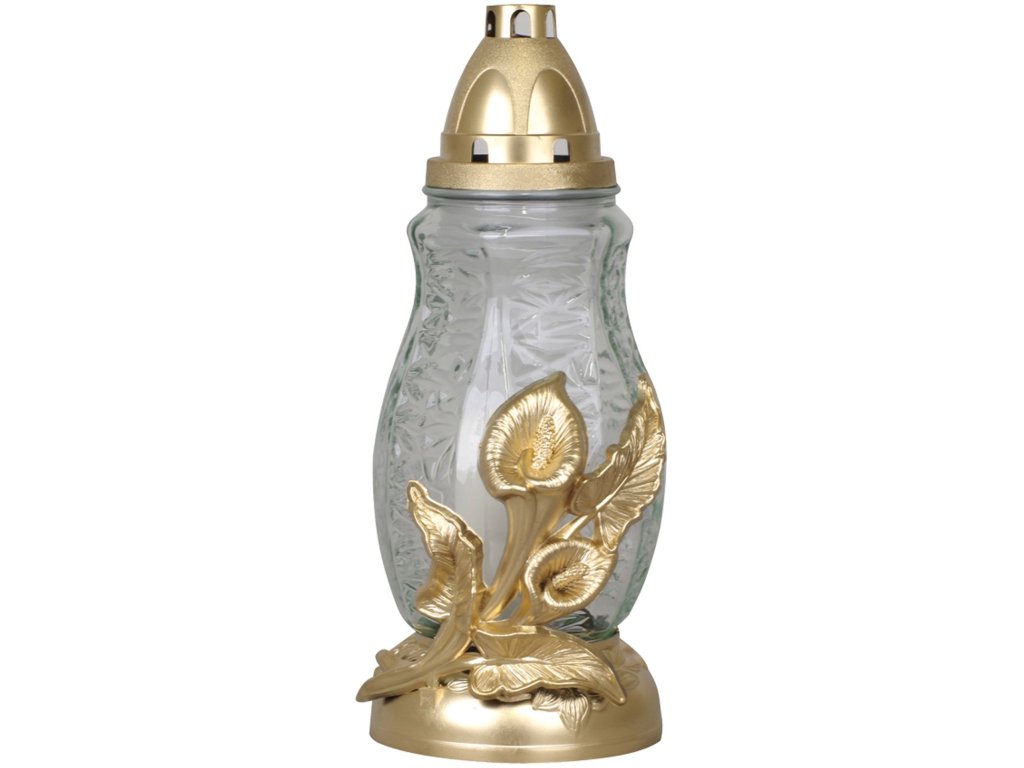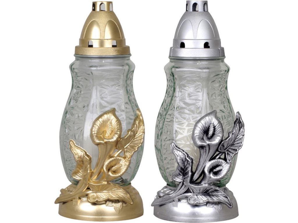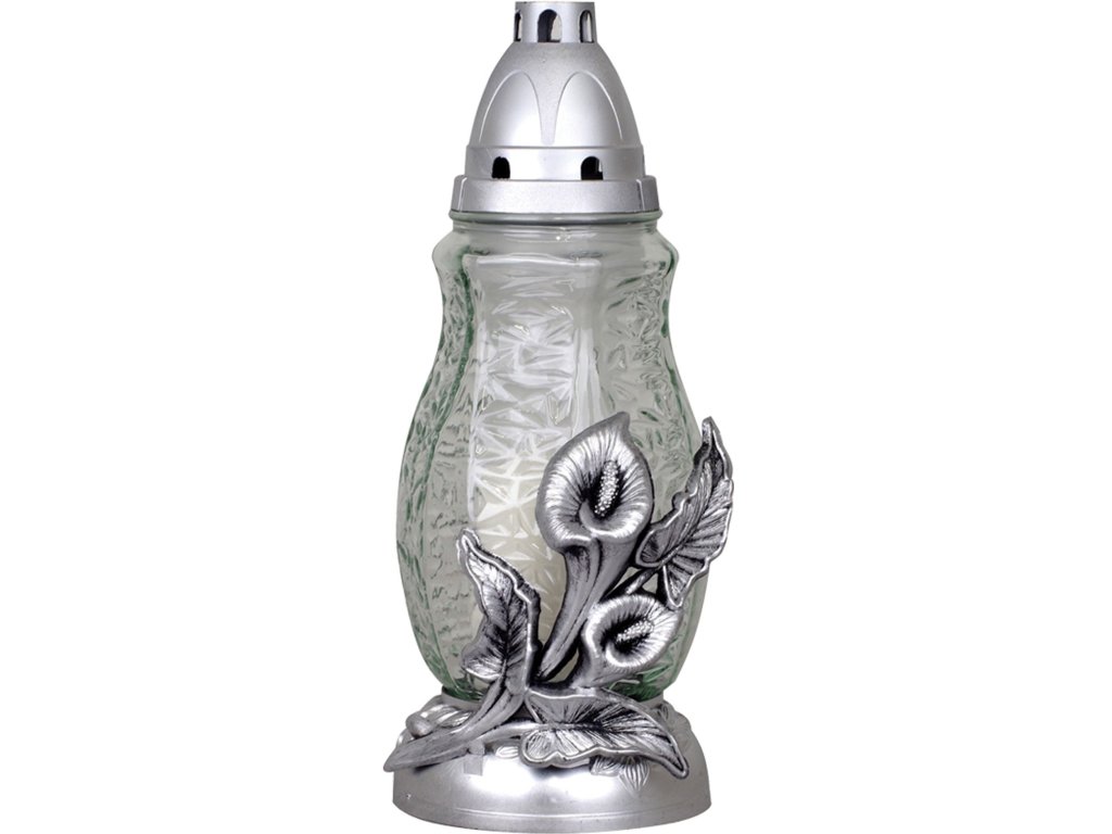 Klasický cenovo dostupný kahanec na hrob s kalami z priehľadného skla a s elegantnou čiapkou doladí hrob Vašich blízkych. Je vhodný aj na využitie pri dodekorovaní smútočných vencov a ikebán. Výber farby nie je možné ovplyvniť. Doba horenia: 40 hodín. Paletové množstvo: 448 ks.