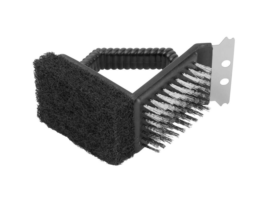 Malá ručná kefa je praktickým prostriedkom pre odstránenie nečistôt z grilu. Má trojuholníkový tvar, pričom každá strana slúži pre iné účely. Jedna strana rúčky slúži na uchopenie kefy. Pre odstránenie najhrubšej špiny sa odporúča použiť nerezovú škrabku. Následne pre dodatočné odstránenie jemnejšej špiny a nečistôt použite druhú stranu trojuholníkovej kefy s nerezovým drôtom. Po očistení grilu od všetkých nečistôt použite tretiu stranu, na ktorej sa nachádza hubka. Pomocou hubky je možné kvalitne vyleštiť povrch čisteného grilovacieho roštu, čím zabezpečíte maximálnu čistotu. Rozmery: 12x7x10 cm.