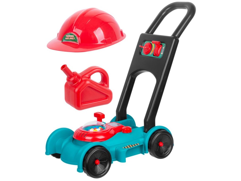Detská záhradná kosačka s prilbou určite poteší každé dieťa. Je vyrobená z plastu, na rukoväti sa nachádza kontrolka zmeny rýchlosti. Kosačka vydáva zvuk naštartovania, guľôčky v bubne počas používania skáču. Balenie obsahuje okrem kosačky aj bezpečnostnú helmu a kanister. Je vhodná pre deti od 3 rokov.