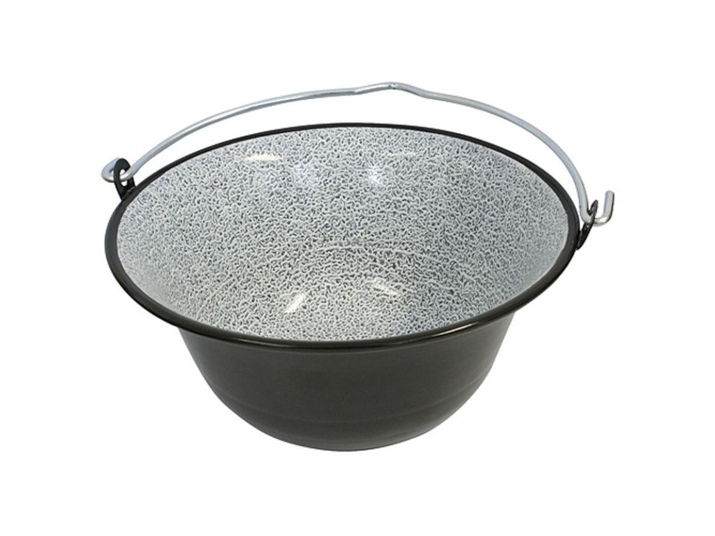 Kovový kotlík 6 lit, smaltovaný na guľáš s pozinkovaným kovovým držadlom. Vhodný na prípravu jedla pri táborení v prírode, pri vode alebo v domácnosti.