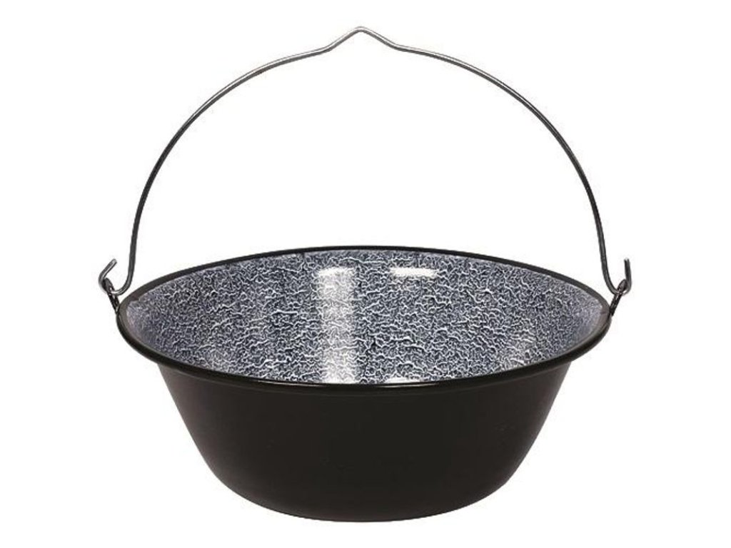 Kovový kotlík 8 lit, smaltovaný na guľáš s pozinkovaným kovovým držadlom. Vhodný na prípravu jedla pri táborení v prírode, pri vode alebo v domácnosti.