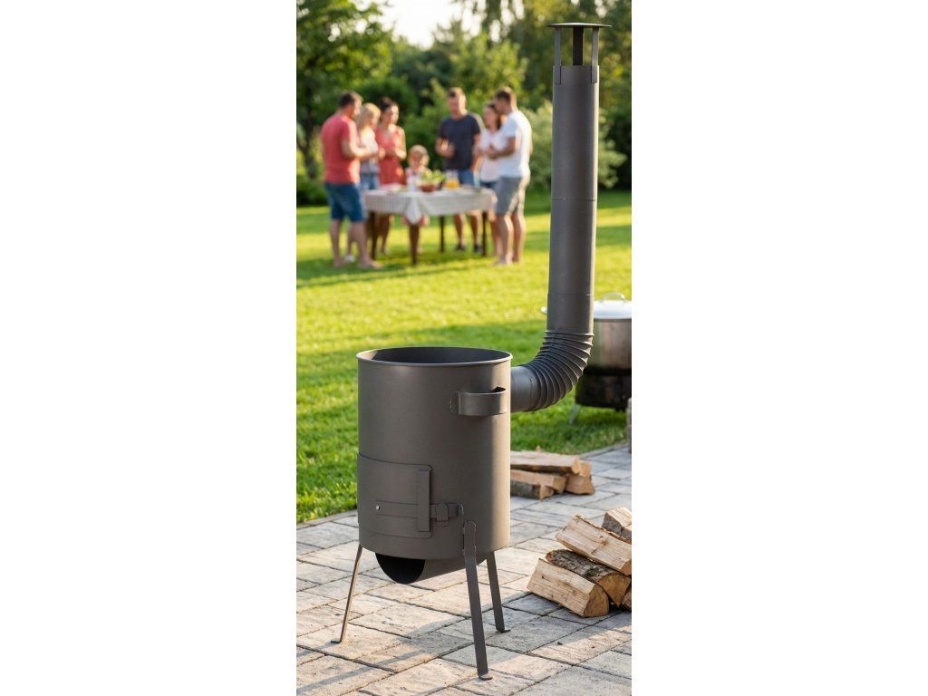 Kotlina Baker pod kotlík s objemom 60 litrov. Priemer kotliny je 56 cm, balenie obsahuje aj dymovod s priemerom 12 cm, koleno a striešku.