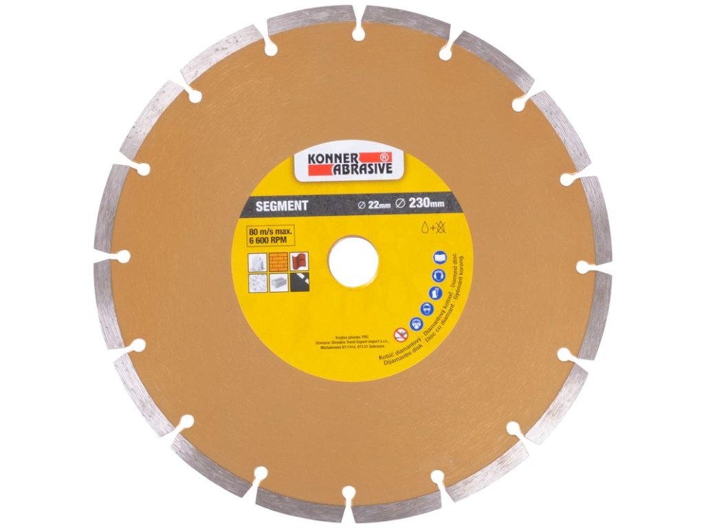 Diamantový kotúč KONNER je určený pre domácich kutilov, ale aj pre profesionálnych remeselníkov. Vhodný je na mokré aj suché opracovávanie. Jeho použitie je rozsiahle - tehly, murivo, kameň, dlažba, obklad, strešná krytina, betón, žula, mramor. Je potiahnutý abrazívnym materiálom pre vyšší výkon. Jeho priemer je 230 mm a maximálne povolené otáčky sú 6600 rpm.
