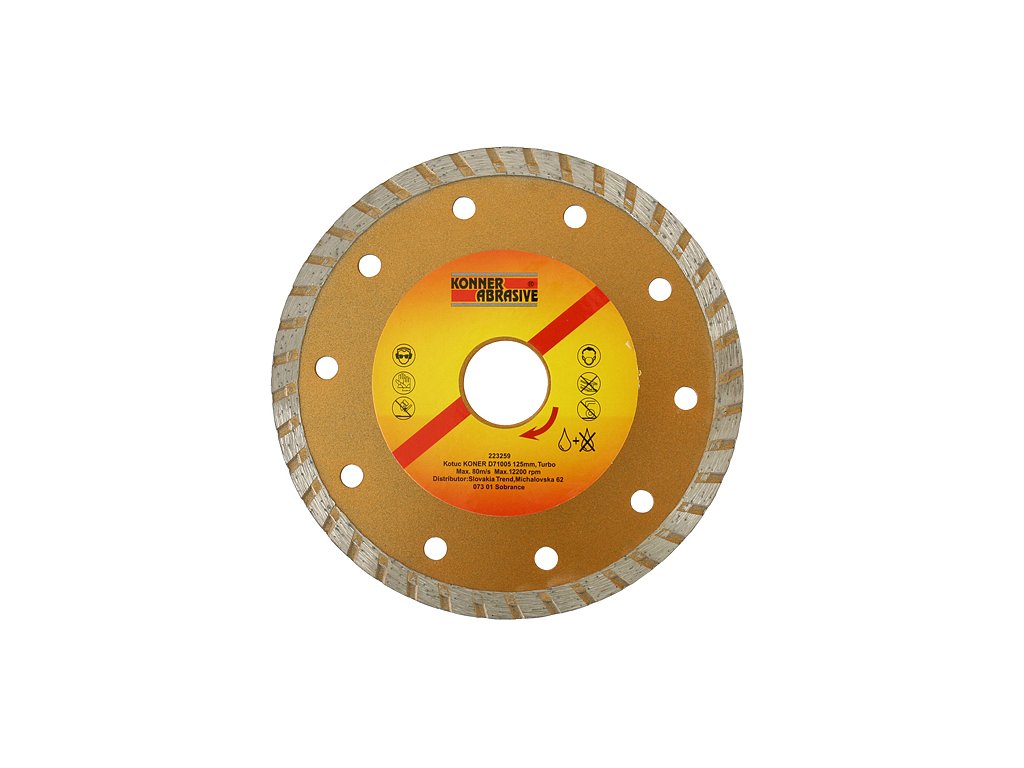 Diamantový kotúč KONNER je vhodný pre domácich kutilov, ale aj pre profesionálnych remeselníkov. Vhodný je na mokré aj suché rezanie. Konštrukcia TURBO+ lemu zachytáva vzduch v pohybe, čím lepšie odvádza materiál, čo zaručuje čistejšie rezné hrany bez odlamovania materiálu, rýchlejšie rezy, optimálnu životnosť a zároveň sa menej zahrieva. Chladiace otvory pomáhajú zvýšiť viditeľnosť pri rezaní odvádzaním materiálu a zaisťujú rozptyl tepla. Má široké použitie - žula, dlažba, obklad, kov a možno ho použiť aj pre mramor, tehly, kameň, murivo a strešnú krytinu. Jeho priemer je 230 mm a maximálne povolené otáčky sú 6 600 rpm.