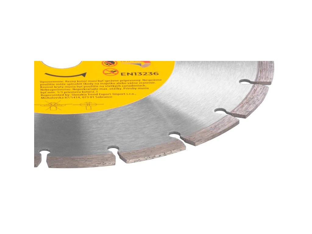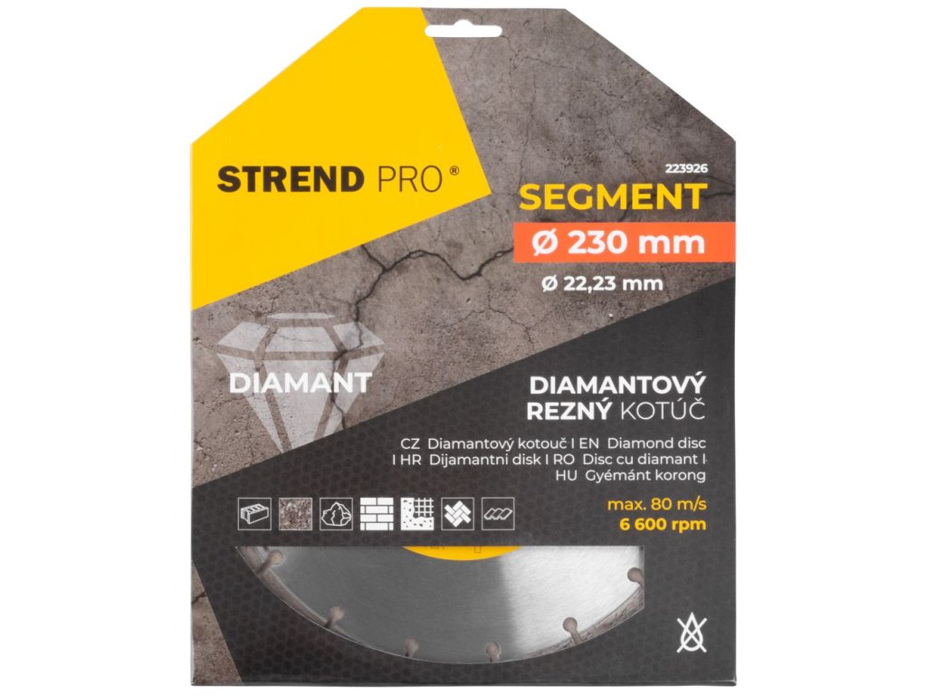Diamantový kotúč Strend Pro je vhodný pre domácich kutilov, ale aj pre profesionálnych remeselníkov. Vhodný je na suché rezanie. technológia SEGMENT poskytuje najvyššiu rýchlosť a výborné chladenie kotúča. Má široké použitie - betón, žula, kameň, murivo, tehly, železobetón a možno ho použiť na obklad, dlažbu a strešnú krytinu. Jeho priemer je 230 mm a maximálne povolené otáčky sú 6 600 rpm.