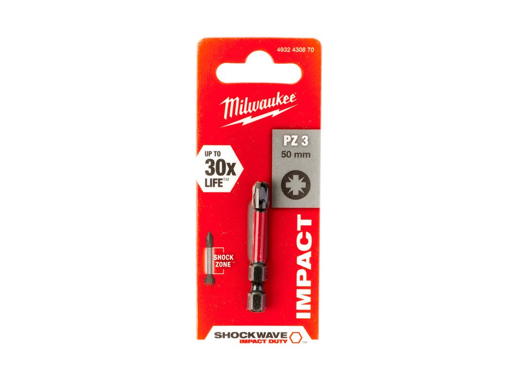- Špeciálne navrhnutá oceľ – Oceľ Milwaukee® so špeciálnym zložením zaisťuje, že bity Shockwave sú odolnejšie voči rázom pri skrutkovaní.
