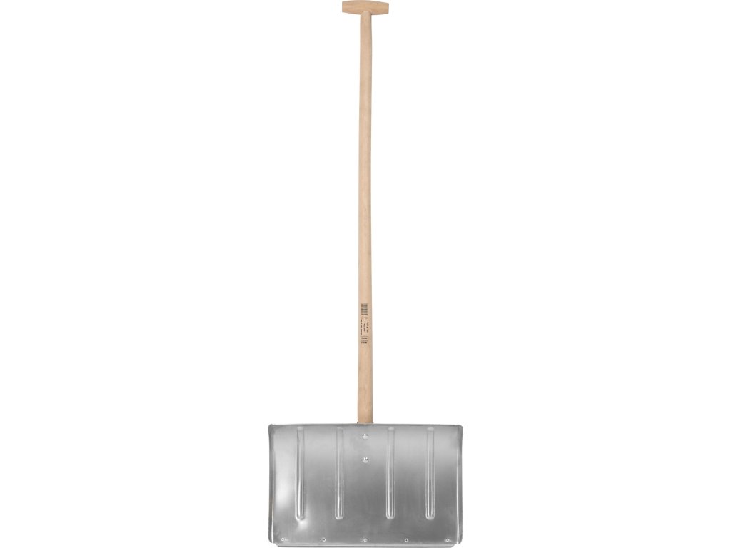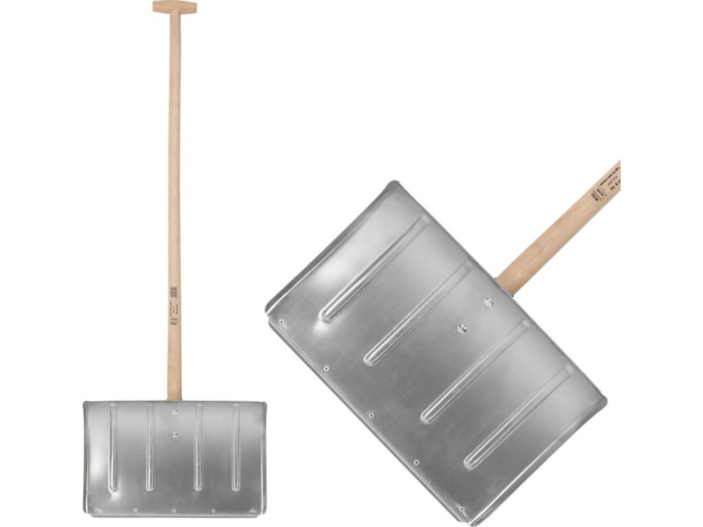 Lopatka je vyrobená z odolného hliníka, ktorý je ľahký, no zároveň dostatočne tuhý, aby odolal aj väčšej záťaži. Na povrchu lopatky sú viditeľné vystužujúce rebrá, ktoré zabraňujú deformácii aj pri pravidelnom a náročnom používaní. Dlhá drevená násada s T-rukoväťou na vrchole zaručuje pohodlné a ergonomické držanie, čím výrazne znižuje únavu chrbta pri dlhšom odhrňovaní snehu.
