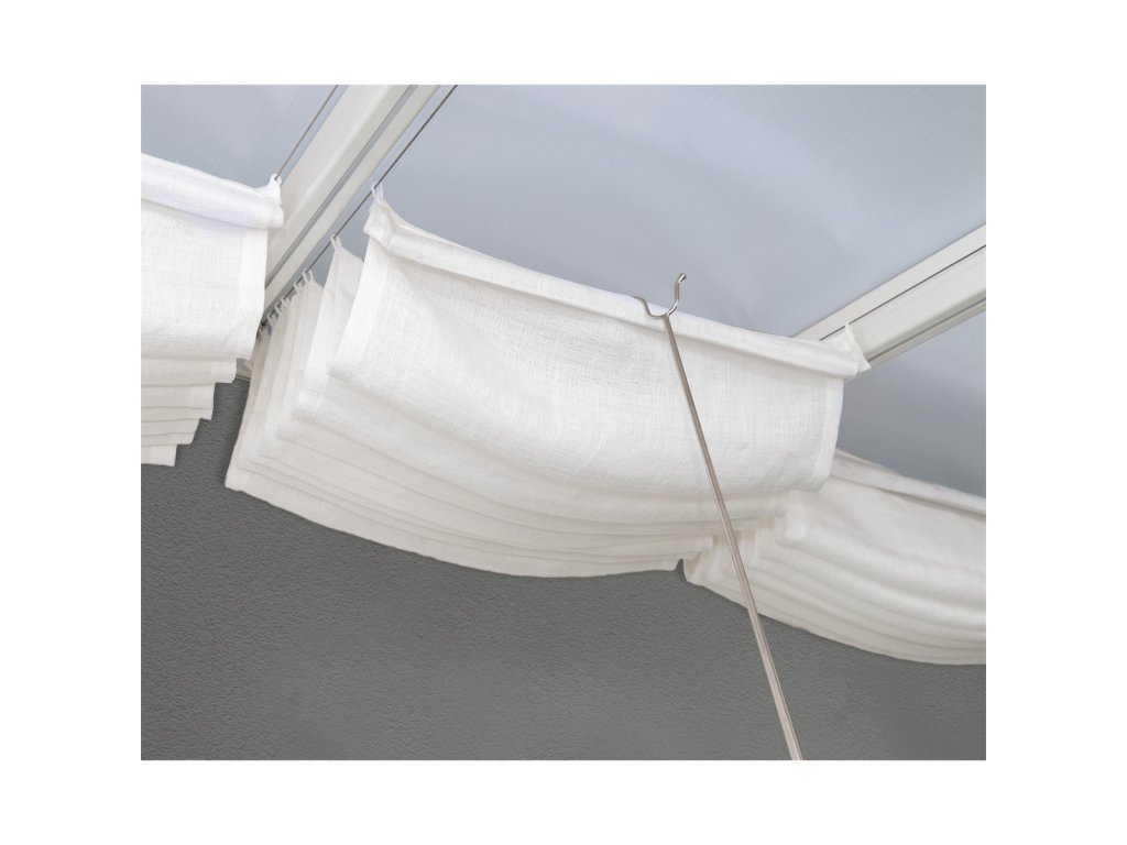 Praktická krémově bílá vícedílná zatahovací zástěna, která se snadno instaluje do drážek profilů pod střechu. V případě slunečného počasí účinně chrání před přílišným přehříváním interiéru.