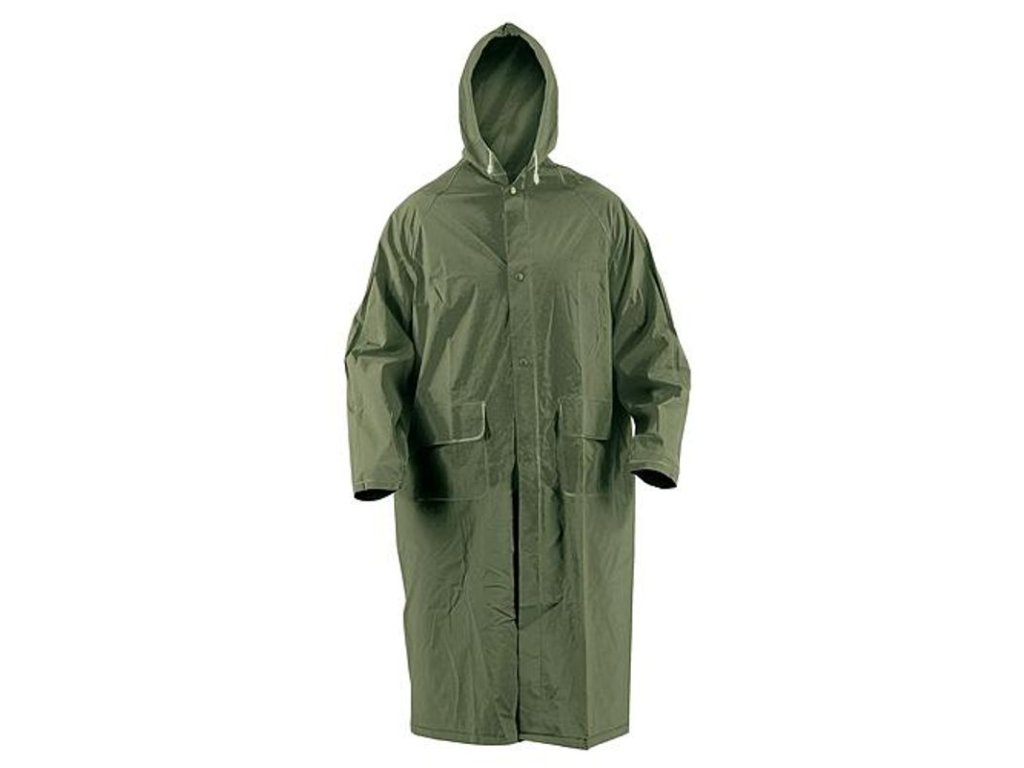 Zelený pršiplášť s kapucňou zo 100% polyesteru s trochou PVC.Do predných vreciek nenatečie voda vdaka krytiu légiámi.S vnútornou manžetou na gumu a ventiláciou na chrbte a pod pazuchami.Komfort pri nosení je zabezpečený zatavenými spojovacími švami.Odporúča sa iba ručne žehliť na max.30 °C. Zakazuje sa bieliť, sušiť v bubnovej sušičke,žehliť,chemicky čistiť. Norma EN ISO 13688.