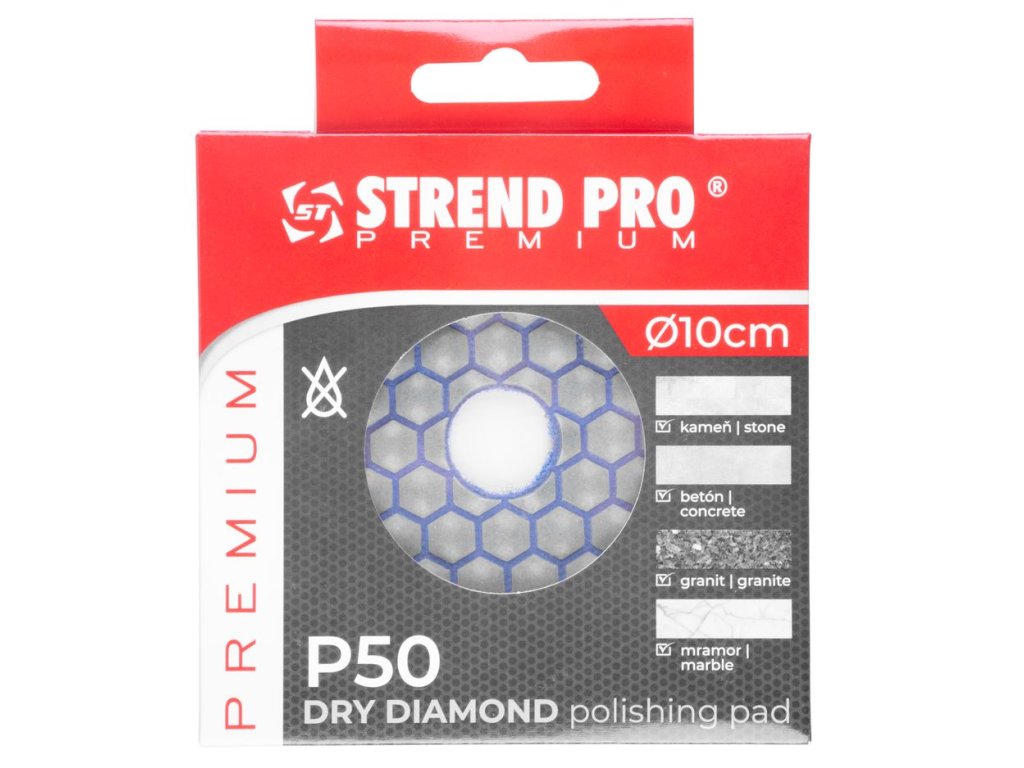 Diamantová, brúsna, leštiaca podložka Strend Pro by nemala chýbať vo výbave profesionálnych remeselníkov, ale aj domácich kutilov. Používa sa pre unášač so suchým zipsom. Slúži na leštenie prírodného kameňa, betónu, granitu a mramoru. Jej priemer je 10 cm a zrnitosť je P50.