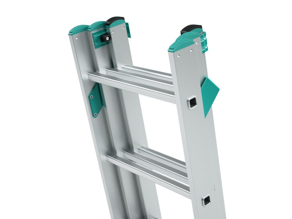 Trojdielny hliníkový univerzálny rebrík EUROSTYL, počet priečok 3 x 11, max. výsuvná dĺžka 7,11 m a šírka 454 mm. S rebríkom sa dá pracovať aj na schodisku.