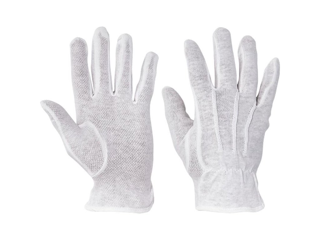 Šitý a bielený bavlnený úplet, bez manžety, pružinka na chrbáte ruky, dlaň a prsty s drobnými bielymi PVC terčíkmi. Veľkosť 6", 7", 8", 9", 10", 11", 12". Norma: EN 420 – všeobecné požiadavky, EN 388 – mechanické riziká. Balenie obsahuje 12 párov rukavíc.