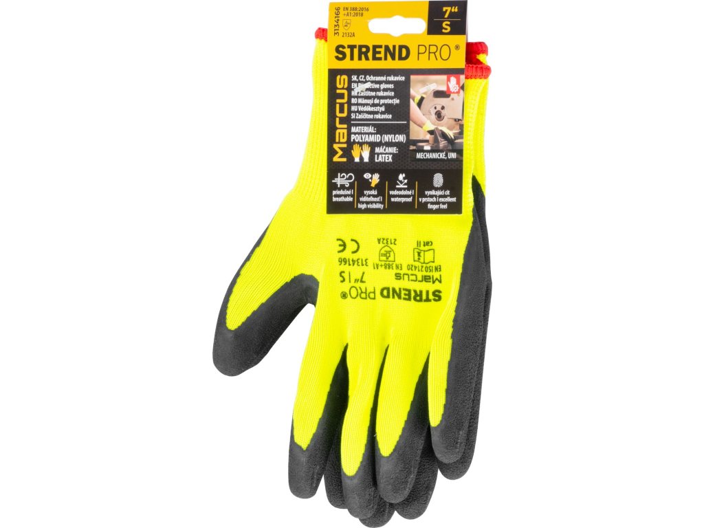 Rukavice Strend Pro Marcus sú pletené bezšvové polyamidové (nylonové) ochranné rukavice a sú potiahnuté vrstvou mikroporézneho paropriepustného latexu na dlani a prstoch. Majú pružný náplet na zápästí. Práca v týchto rukaviciach je komfortná, keďže sú priedušné, vodeodolné a poskytujú vynikajúci cit v prstoch. Sú určené na ochranu kože pred mechanickými rizikami, s úrovňou ochrany 2132A (podľa EN388: 2016+A1:2018). Veľkosť: 07"/S. Balenie obsahuje 12 párov rukavíc.