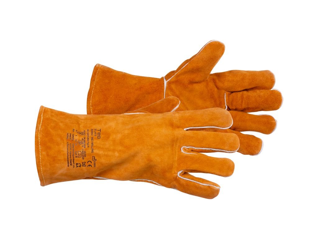 Celokožené zváračské rukavice Strend Pro Industrial Teo.Dlaň, chrbát a manžeta sú vyrobené z hovädzej štiepenky. Dlaň a chrbát majú fleecovú podšívku, manžeta bavlnenú podšívku. Spĺňajú normu EN ISO 21420:2020 (cat II).