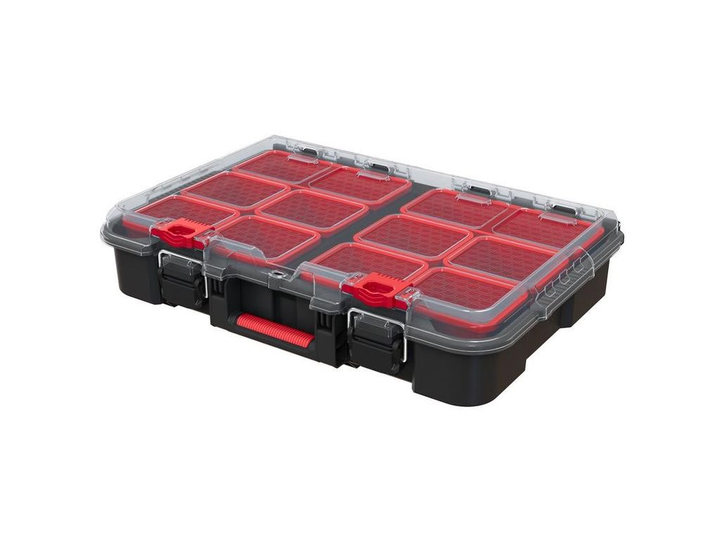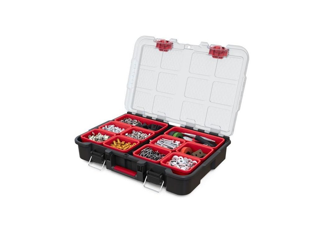 - organizérje vybavený rukoväťou z mäkkej gumy, prepínacími kovovými západkami, bočnými úchopmi, odnímateľnými priehradkami organizéra rôznych veľkostí pre vlastnú konfiguráciu, očkom na visiaci zámok, priehľadným vekom organizéra s antimigračnou štruktúrou pre viditeľnosť obsahu (kapacita 10 kg); 51,5 x 34,5 x 11,5 cm (DxŠxV)