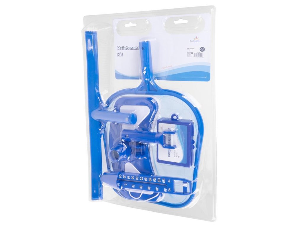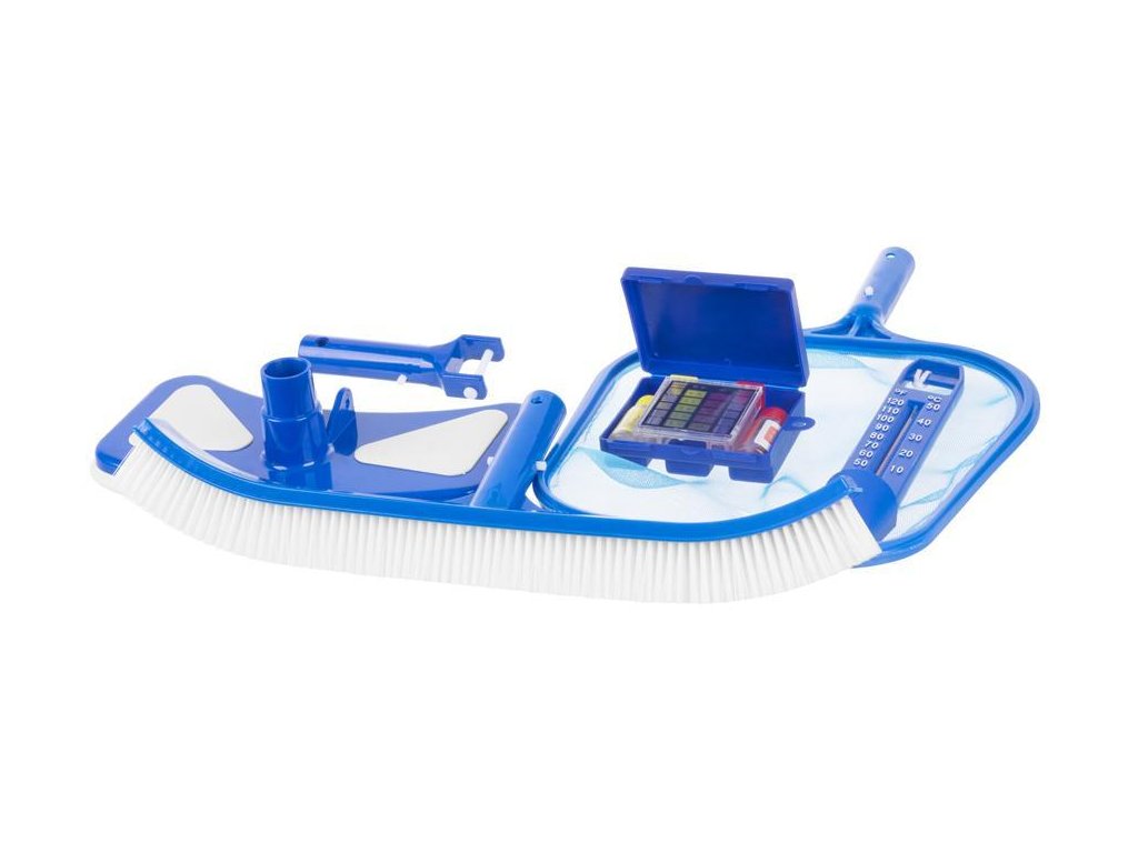 Praktická sada na údržbu bazénu obsahuje základné náradie, ktorého súčasťou je : kefa na tyč, vysávacia hlavica, teplomer, sieťka, sada testerov.