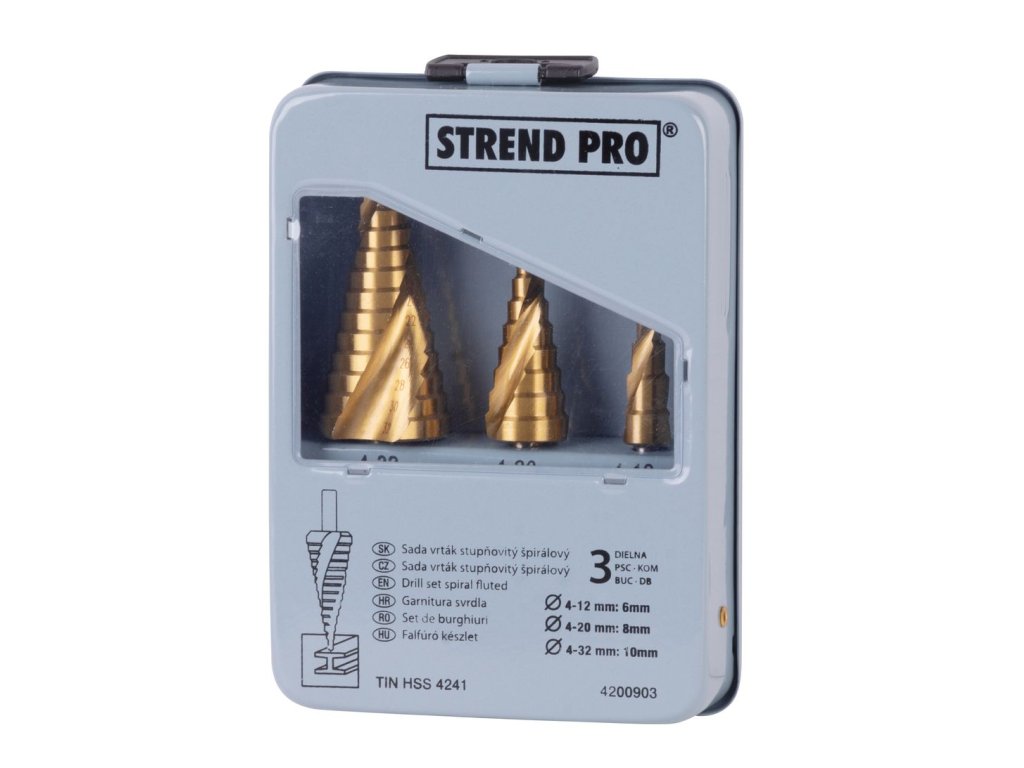 Sada stupňovitých špirálových vrtákov Strend Pro by nemala chýbať vo výbave profesionálnych remeselníkov, ale aj domácich kutilov. Je určená na vŕtanie do kovu. Pozostáva z troch vŕtakov: 4 - 12 mm (6 mm), 4 - 20 mm (8 mm), 4- 32 mm (10 mm).
