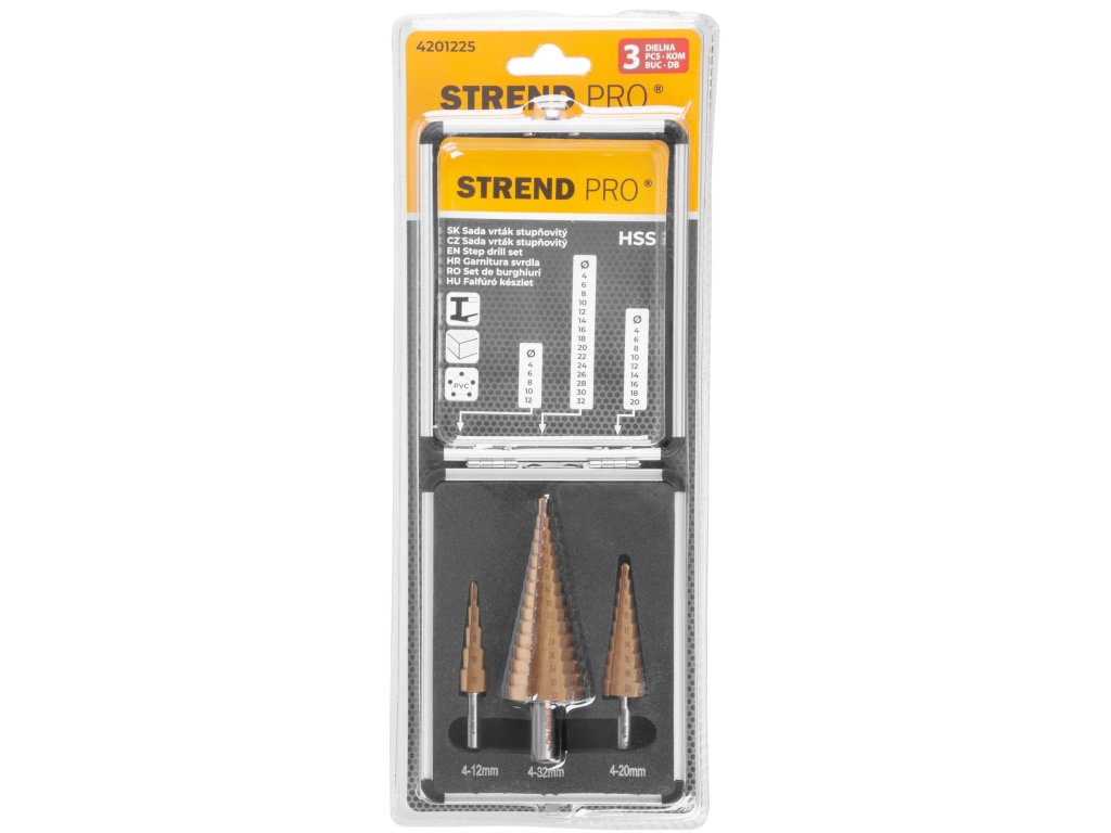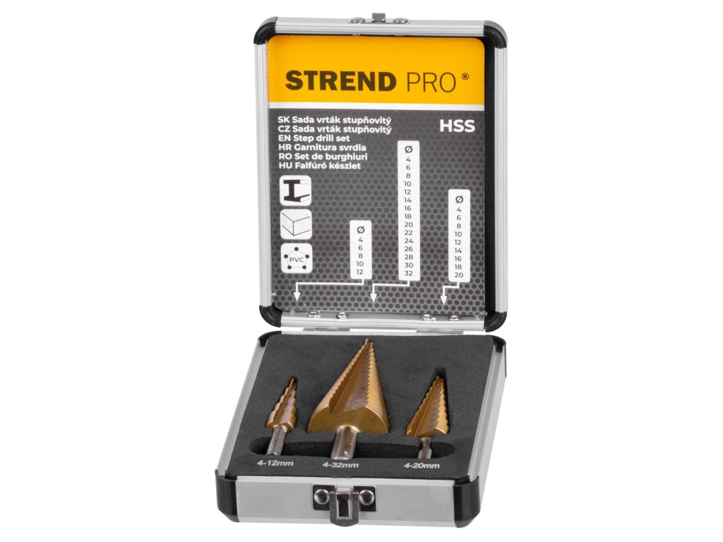 Sada troch stupňovitých vrtákov Strend Pro HSS s titánovou úpravou. Použitie: kov, drevo, plast. V praktickom hliníkovom kufríku nájdete vrtáky s rozmermi: 4-12 mm, 4-20 mm a 4-32 mm.