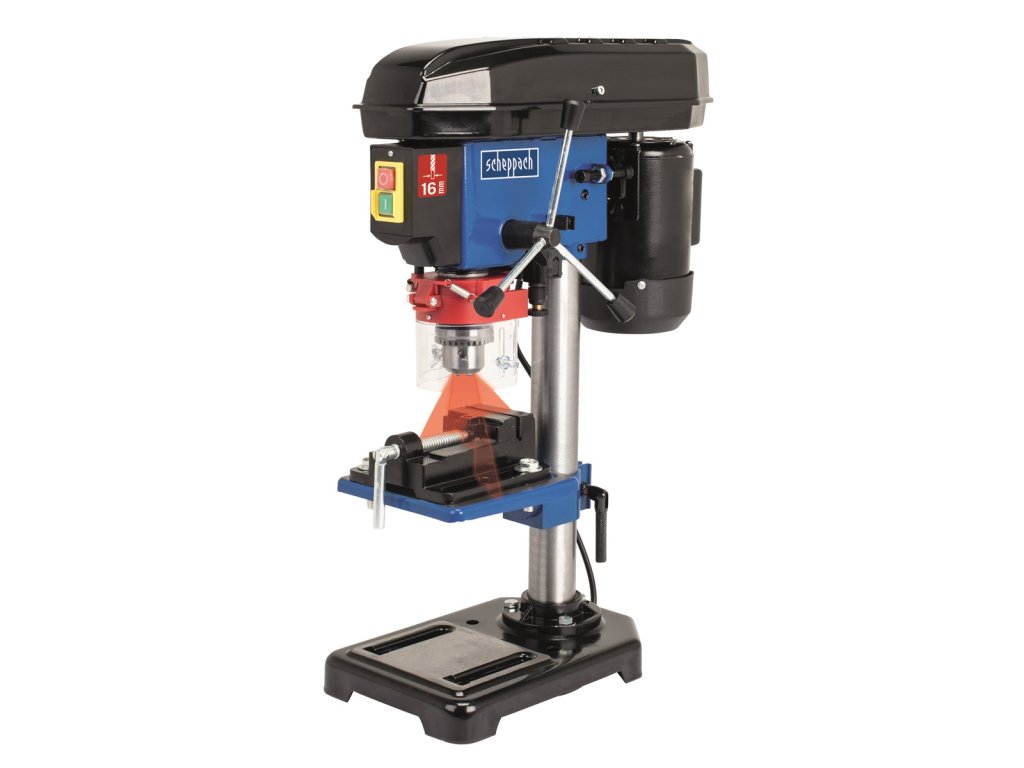Stojanová vrtačka Scheppach DP 16 VL je výborně vybavený model malé stojanové vrtačky vhodný hlavně pro náročné domácí kutily, do malých dílen ap. Zásadní odlišností od běžných strojů v této třídě je křížový laser, který umožní velmi snadnou orientaci při vrtání a urychlí práci při vrtání větších sérií obrobků. Stroj má robustní ocelovou konstrukci, sklíčidlo 13 mm ve standardu, pět stupňů rychlosti pro práci s tvrdým a měkkým dřevem, kovy i plasty, svěrák pro přidržení obrobku na pracovním stole a silný motor 500 W, který si poradí s jakýmkoliv materiálem. Stroj samozřejmě splňuje poslední požadavky evropské unie na bezpečnost, jako je např. hlavní vypínač umístěný na čele stroje, průhledný kryt sklíčidla ap. Stroj je umístěn na stabilním podstavci s možností pevného uchycení šrouby k pracovní desce nebo podlaze.