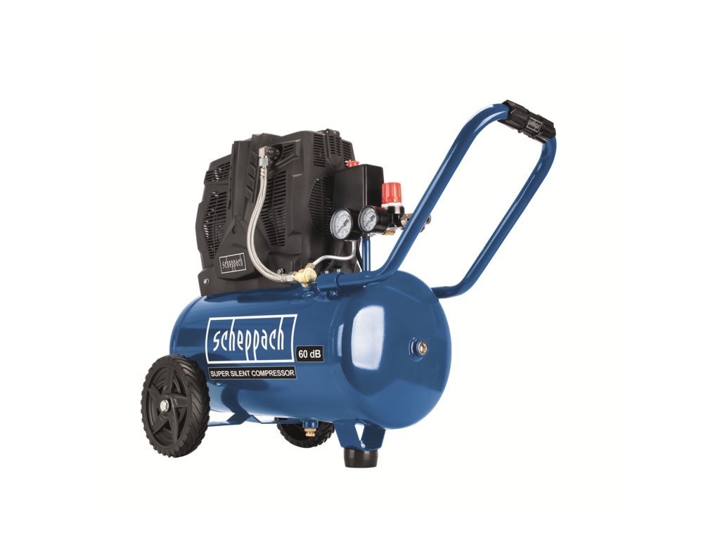 Kompresor Scheppach HC 25 Si je tichý bezolejový dvouválcový kompresor, který je vhodný i do míst a provozů s vysokými požadavky na nízkou míru hluku. Hlučnost 60 dB (A) znamená hladinu hluku zhruba na úrovni bublání varné konvice, takže v praxi budete vnímat hluk tohoto kompresoru pouze minimálně. Další výhodou je bezolejová technologie, která znamená, že do vzdušníku ani dále do spotřebiče vzduchu, neunikají žádné olejové páry. To se hodí v potravinářství, u speciálních lakýrnických prací nebo třeba při tlakování výčepních zařízení. Bezolejová technologie znamená rovněž mnohem nižší nároky na údržbu celého stroje. Scheppach rovněž odstranil běžnou nevýhodu tichých kompresorů, a to poměrně nízký sací výkon. Díky nové technologii je sací výkon 230 l/min téměř dvakrát vyšší, než je běžné a je plně srovnatelný s klasickými kompresory. Vzdušník o objemu 24 l slouží jako zásobárna stlačeného vzduchu a motor se tak automaticky zapíná jen v případě, že tlak vzduchu klesne pod požadovanou úroveň. Vzdušník rovněž výrazně rozšiřuje možnosti kompresoru a stroj se tak stává opravdu multifunkčním pomocníkem. Díky němu můžete s kompresorem, mimo běžného huštění a ofukování, provádět i náročnější operace s použitím různých druhů pneumatického nářadí. Kompresor je vybaven manometrem vzdušníku i manometrem pro kontrolu pracovního tlaku. Přídavné madlo a kolečka umožní snadnou manipulaci se strojem, antivibrační podstavec zase zajistí klidný chod stroje.