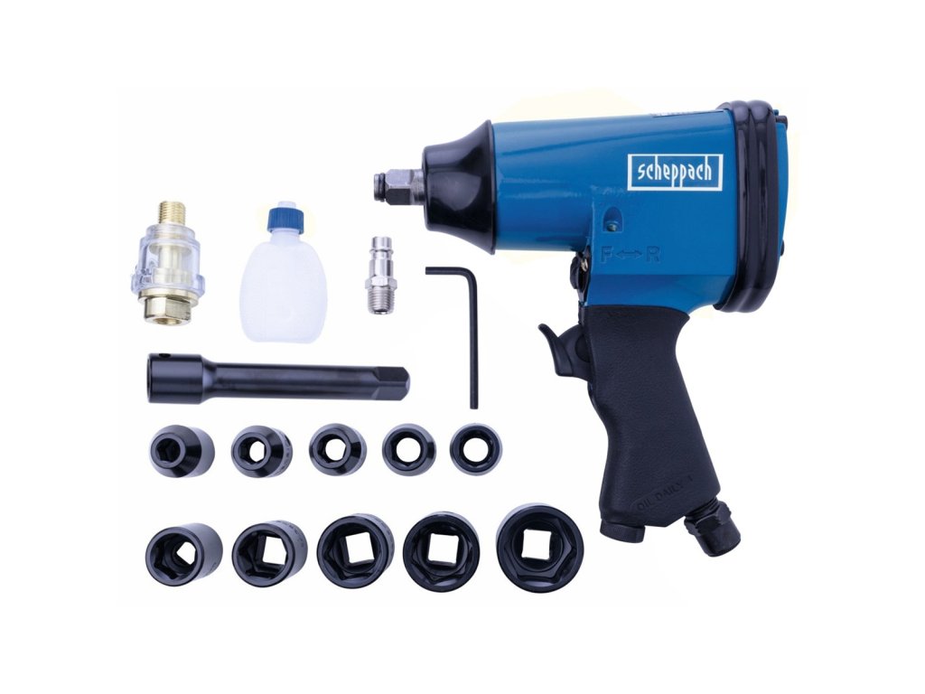 příslušenství: 10 x 1/2" nástrčných hlavic, prodlužovací nástavec, maznička, olej, imbusový klíč, konektor pro rychlospojku, olejový přimazávač vzduchu