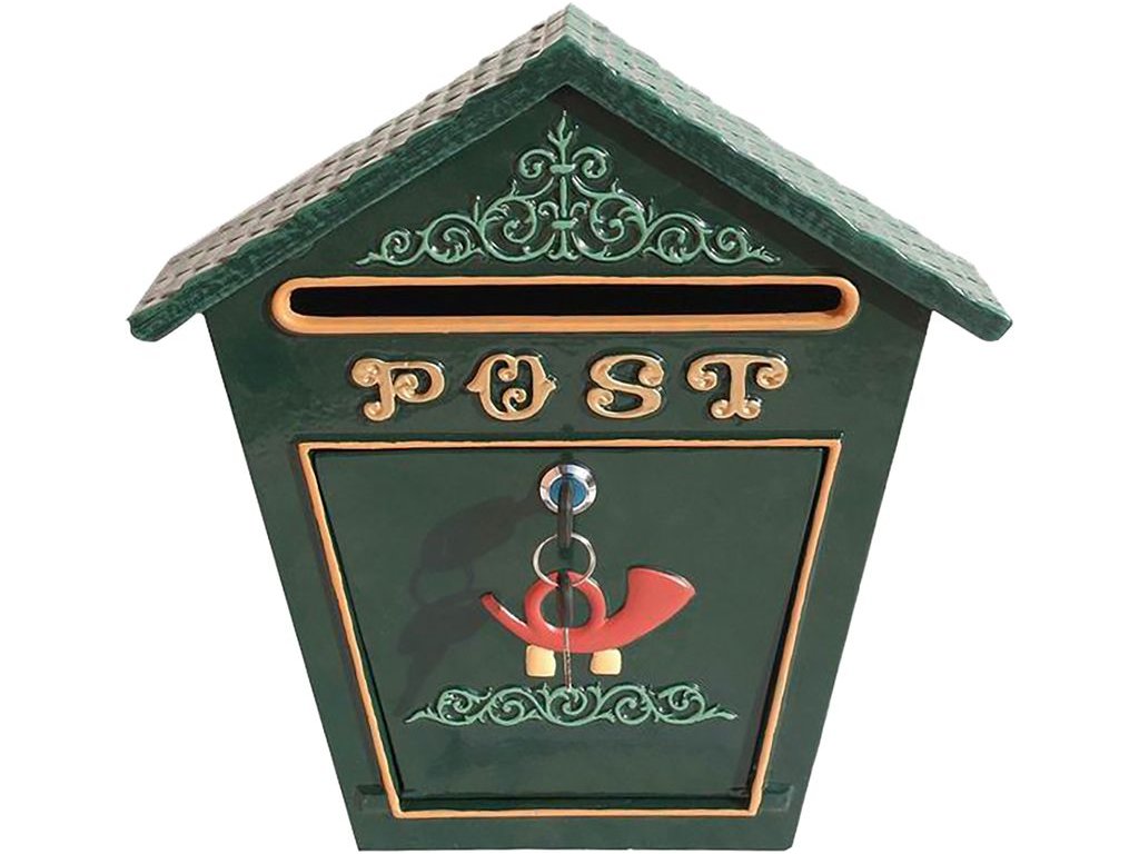 Poštová schránka Albert v elegantnej zelenej farbe je navrhnutá v tradičnom štýle s ozdobným reliéfom a výrazným nápisom POST. Vďaka svojmu tvaru so strieškou pôsobí dekoratívne a zároveň chráni poštu pred nepriaznivým počasím.