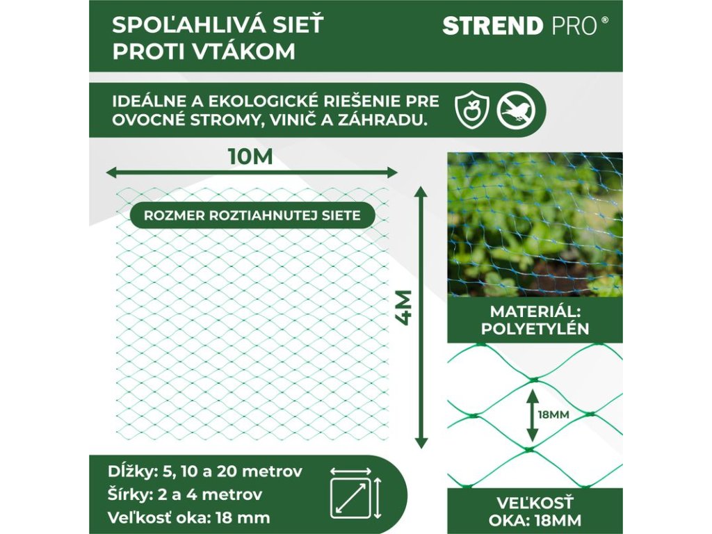 Sieť Strend Pro, 4x10 m, oko 18 mm, proti vtákom, PE