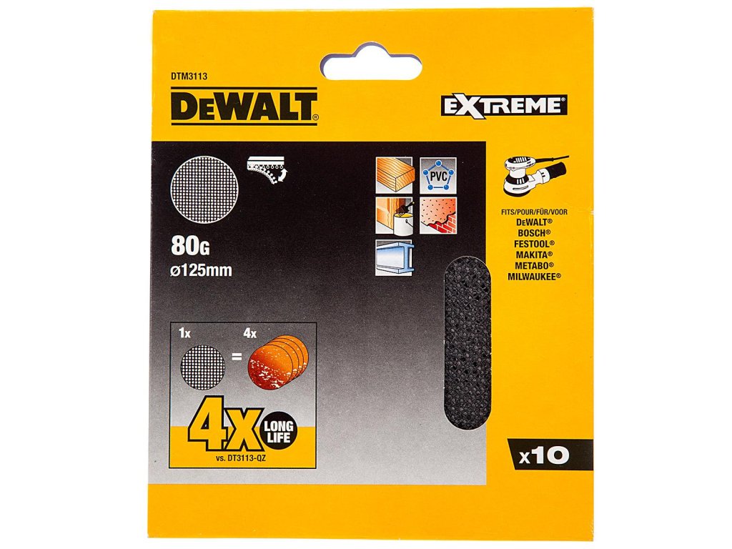 Až 4× dlhšia životnosť než u štandardných brúsnych papierov DeWALT vďaka lepšiemu odvodu prachu z brúsenia