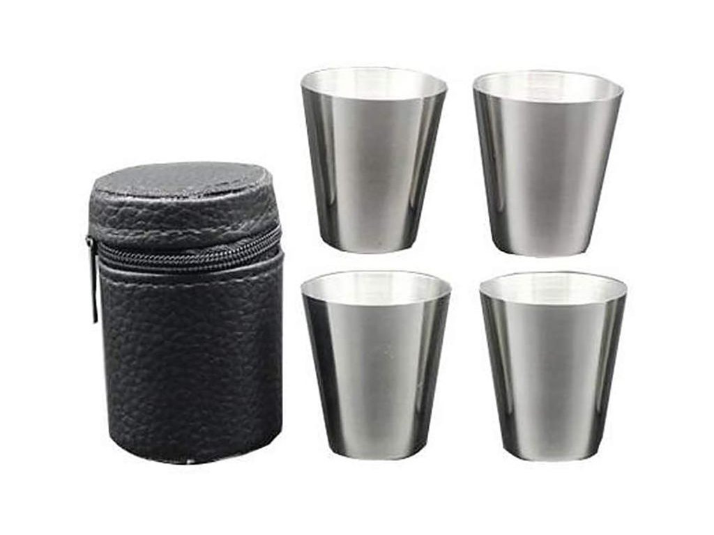 4 štamperlíky MagicHome v koženkovom puzdre. Štamperlíky s objemom 30 ml sú vyrobené z nerezu.