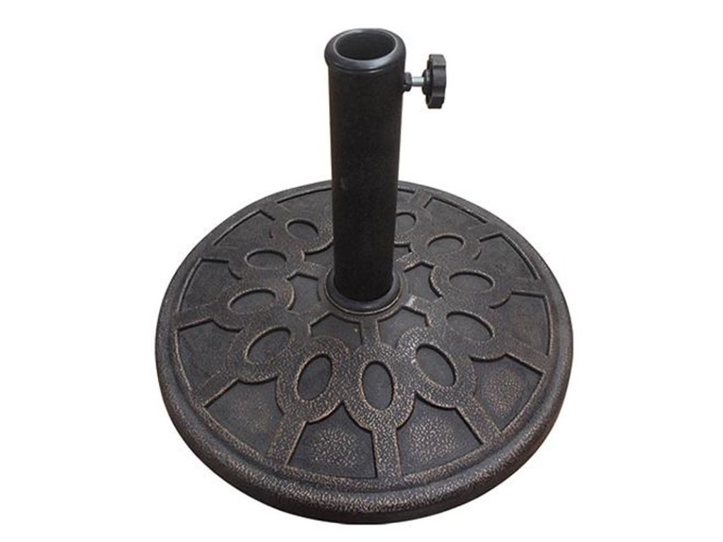 Stojan na plážový slnečník alebo dáždnik je vyrobený z pevného prírodného živicového materiálu. Spodná podstava vizuálne pripomína skôr kovový charakter, no oproti klasickému kovovému nie je tak ťažký. Navyše je celá spodná časť zvýraznená zaujímavým vzorom. Priemer tejto podstavy je 43 cm. Z podstavy vychádza stredová tyč, do ktorej sa napája slnečník. Výška tyče je 33 cm, čím poskytuje dostatočné prekrytie a spojenie častí slnečníka a stojanu. Maximálny priemer tyče požadovaného upevneného slnečníka je v rozmedzí od 38 do 52 mm. Po vložení slnečníka do tyče vychádzajúcej z podstavy je už len potrebné zaistiť ho prikrútením kolieska na boku. Hmotnosť stojanu je 9 kg.