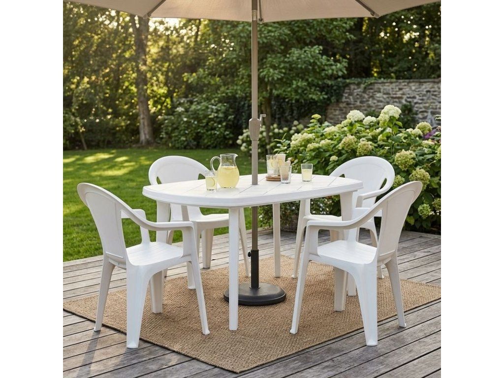 Jednoduchý biely plastový stôl je určený pre vonkajšie využitie. Stôl je možné umiestniť do záhrady alebo na terasu. Výhodou stola je otvor na slnečník v strede užívateľskej plochy, ktorý vám poskytne príjemné tienenie. Stôl je vďaka plastovému povrchu veľmi pevný, ale tiež ľahký na údržbu a skladanie. Rozmery stola sú 137 x 90 x 73 cm. Jeho hmotnosť je iba 6,5 kg, vďaka čomu dokážete stôl jednoducho premiestniť na potrebné miesto.