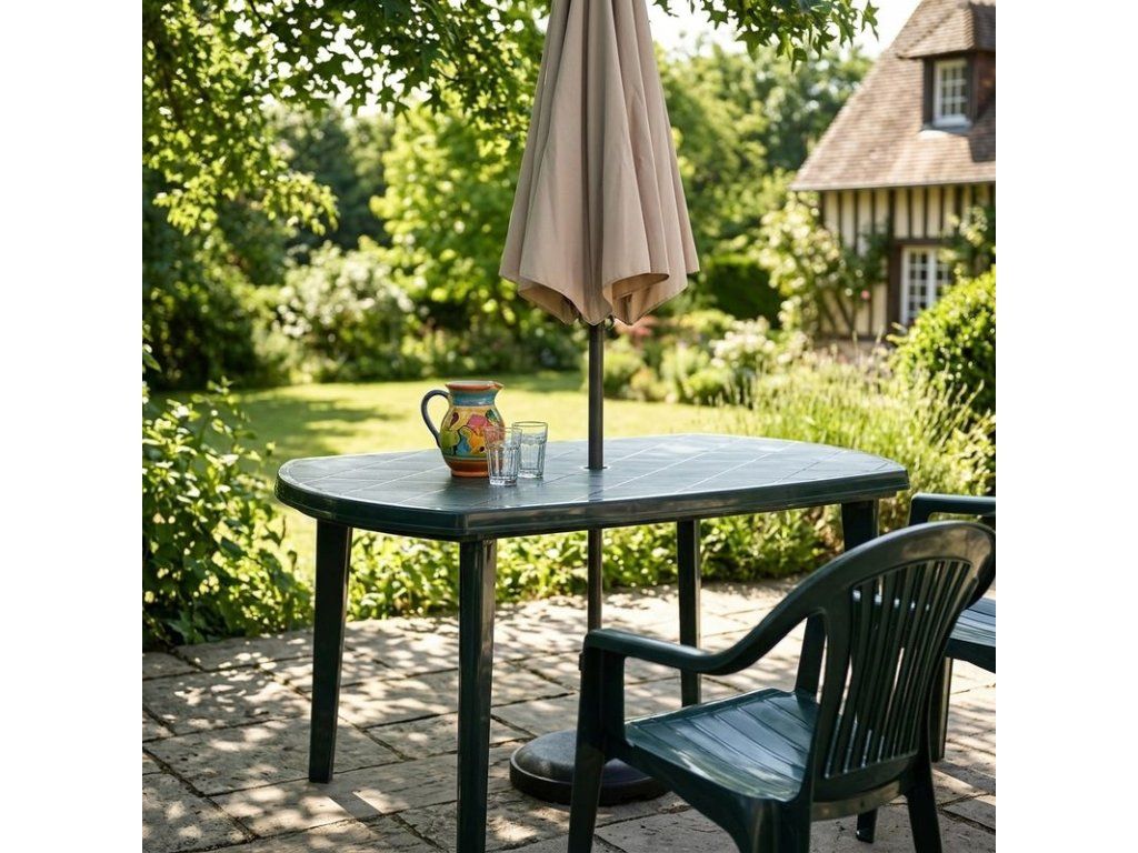 Jednoduchý zelený plastový stôl je určený pre vonkajšie využitie. Stôl je možné umiestniť do záhrady alebo na terasu. Výhodou stola je otvor na slnečník v strede užívateľskej plochy, ktorý vám poskytne príjemné tienenie. Stôl je vďaka plastovému povrchu veľmi pevný, ale tiež ľahký na údržbu a skladanie. Rozmery stola sú 137 x 90 x 73 cm. Jeho hmotnosť je iba 6,5 kg, vďaka čomu dokážete stôl jednoducho premiestniť na potrebné miesto.