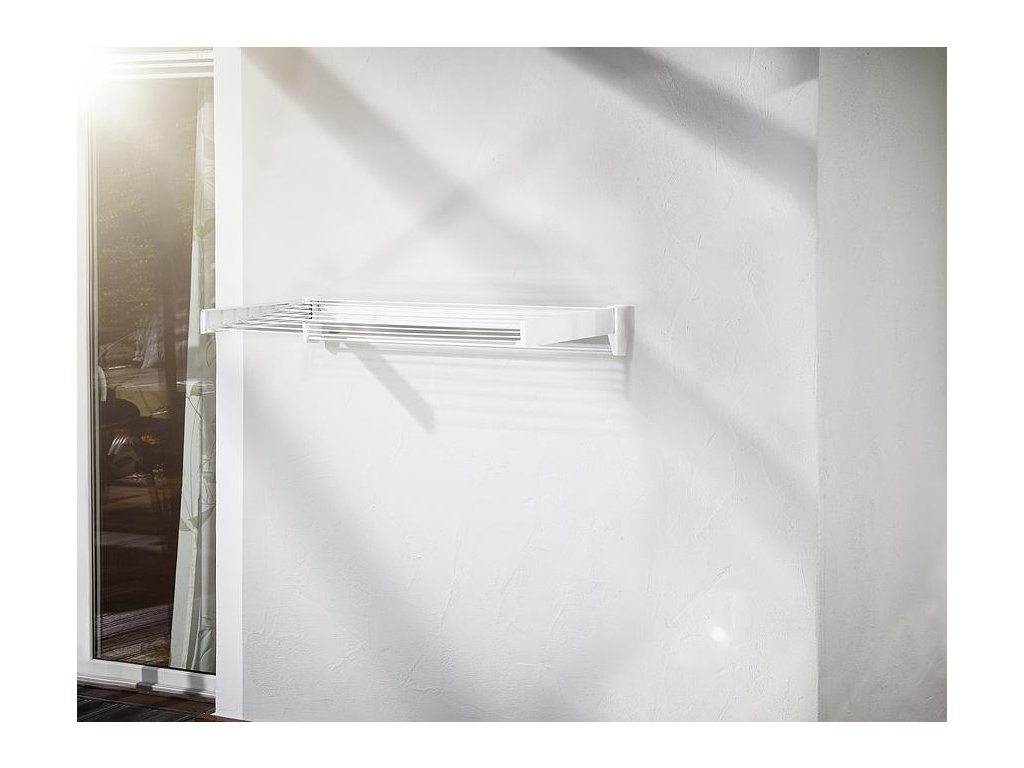 Praktický skladací nástenný sušiak na bielizeň, šetrí miesto, vhodný nielen do kúpeľne, samostatný chrómovaný vešiak na osušky, šírka tyčí 70 cm, 3,6 m sušiacej plochy, záruka 3 roky.