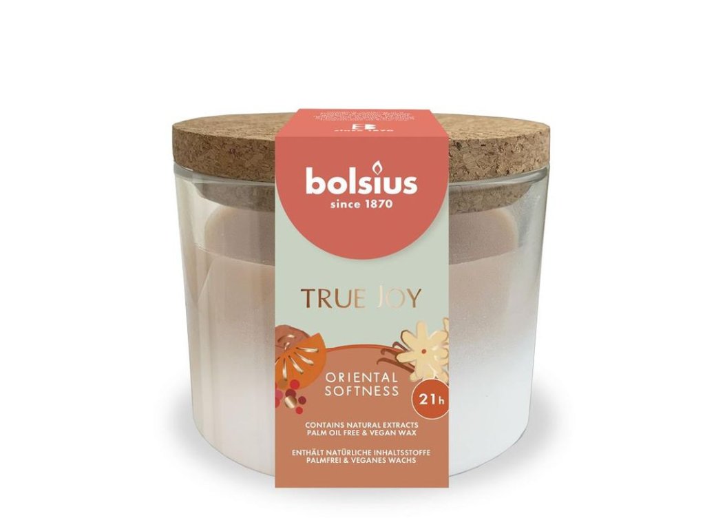 Kolekcia, ktorá šíri čistú radosť. Kolekcia True Joy s prírodnými výťažkami, rastlinným voskom a bez palmového oleja spája krásu prírody prostredníctvom jej farieb, tvarov a vôní. Prebuďte svoje zmysly s vôňou sviečky bolsius True Joy Oriental Softness! So sviežou arómou machu, drevených tónov s nádychom pomaranča a pudrovej ambry presýtite celú izbu. Sviečka vydrží horieť až 21 hodín.