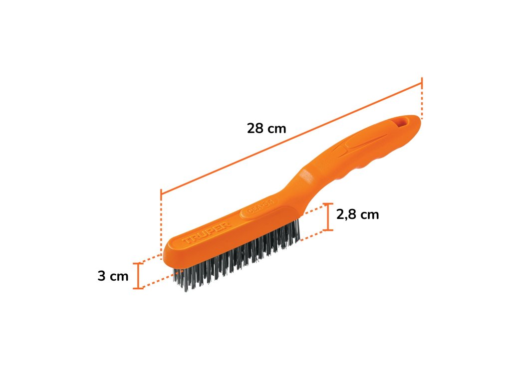 Drôtená oceľová kefa TRUPER CEA-54: robustný nástroj s 64 karbónovými štetinami a ergonomickou rukoväťou. Ideálna na odstraňovanie hrdze, starých náterov a nečistôt z kovových, drevených a betónových povrchov. Nevyžaduje montáž.