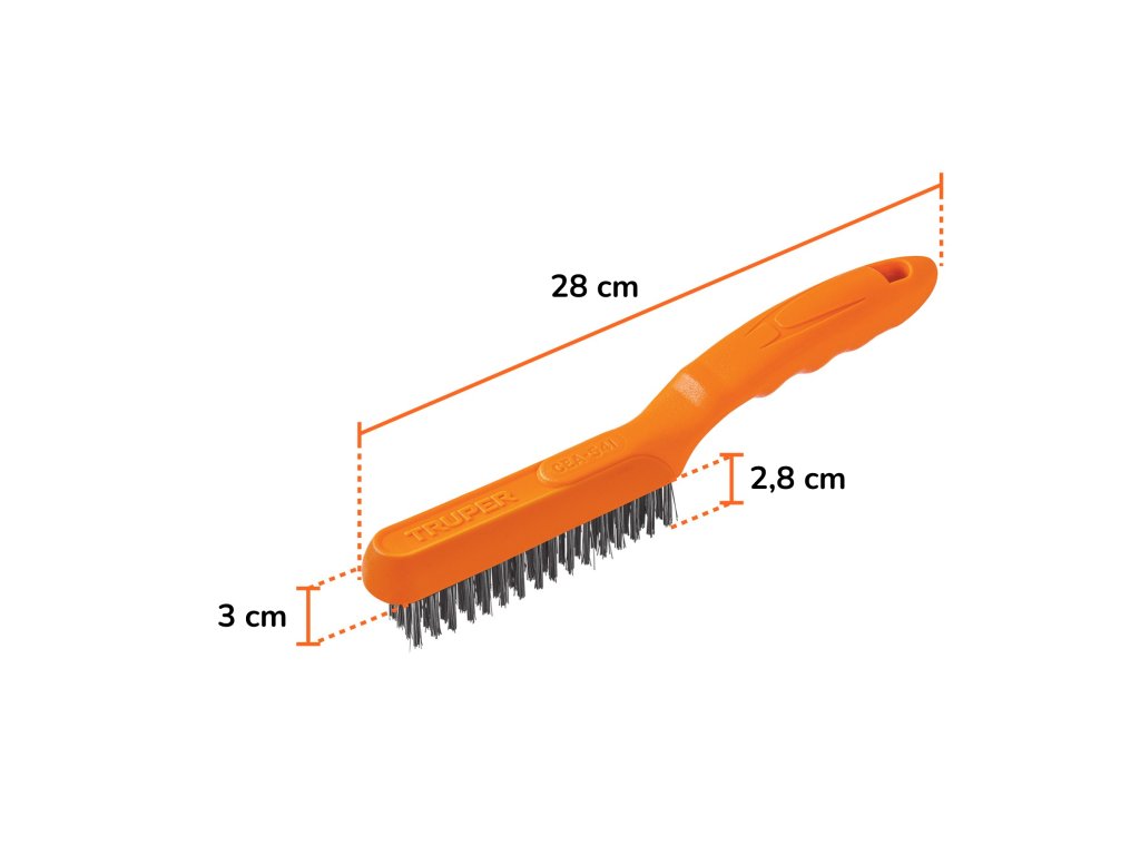 Drôtená oceľová kefa TRUPER CEA-54I: robustný nástroj s 64 štetinami z nehrdzavejúcej ocele a ergonomickou rukoväťou. Ideálna na odstraňovanie hrdze, starých náterov a nečistôt z kovových, drevených a betónových povrchov. Nevyžaduje montáž.