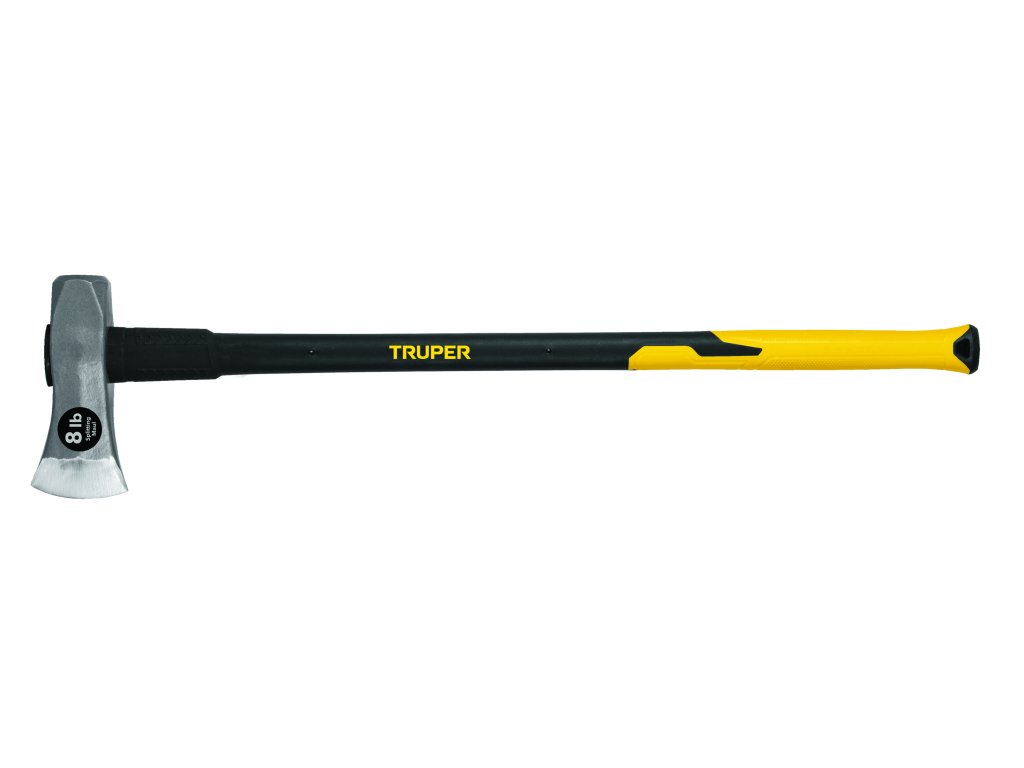 Kovaná štiepacia sekera TRUPER TJ-8F: Robustná 3,6 kg sekera s oceľovou hlavou a 91 cm sklolaminátovou rukoväťou, ideálna na efektívne štiepanie tvrdého a objemného dreva.