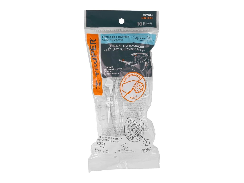 TRUPER – Ochranné okuliare LEN-LT-AE: číre, anti-fog, UV ochrana, polykarbonát: Ľahké ochranné okuliare s polykarbonátovým sklom, UV ochranou a úpravou proti zahmlievaniu pre bezpečnú prácu.