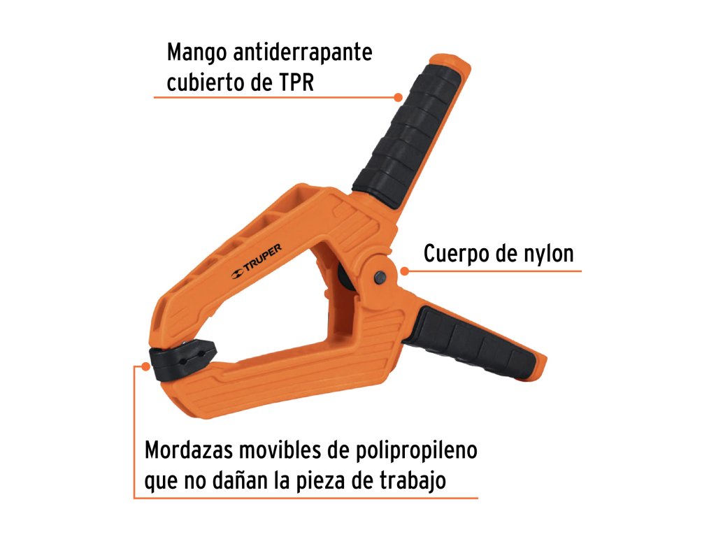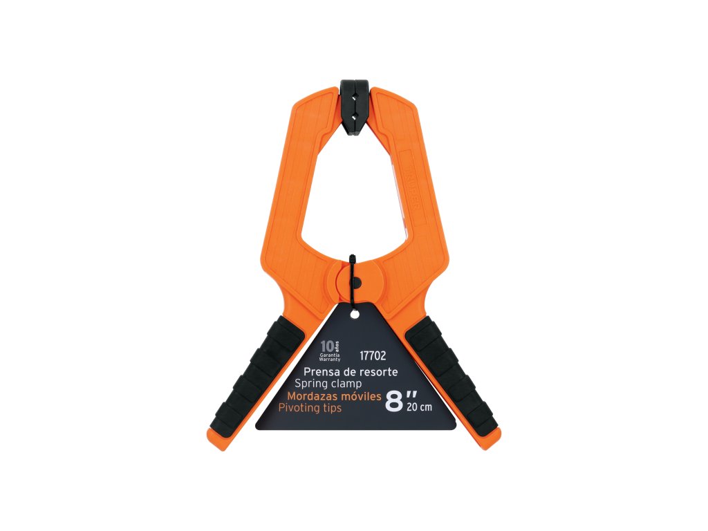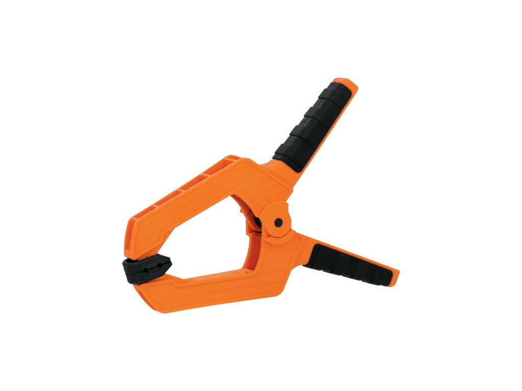 TRUPER – Pružinová svorka PRE-8: odolná svorka s nylonovým telom, protišmykovou TPR rukoväťou a pohyblivými čeľusťami, vhodná na rýchle a bezpečné upnutie materiálu bez poškodenia povrchu.